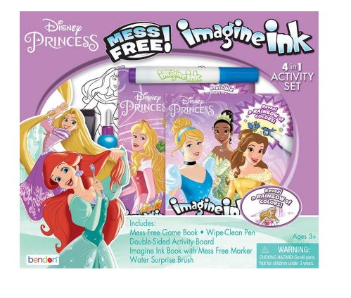 It's our most comprehensive imagine ink set ever! Bendon's Imagine ink 4-in-1 activity box set comes with all kinds of cool coloring tools to use on the included Magic ink activity book, mess free game book, and dual-sided water surprise/dry-erase board! Color with special mess free marker, water surprise brush, or dry-erase marker for hours of coloring fun! This set includes a 12-page magic ink activity book, 12-page mess free game book, double-sided activity board, water surprise brush, and magic ink marker. The double-sided activity board features dry-erase activities on one side and re-colorable water surprise scene on the other. Ideal for ages 3 and up.Specifications