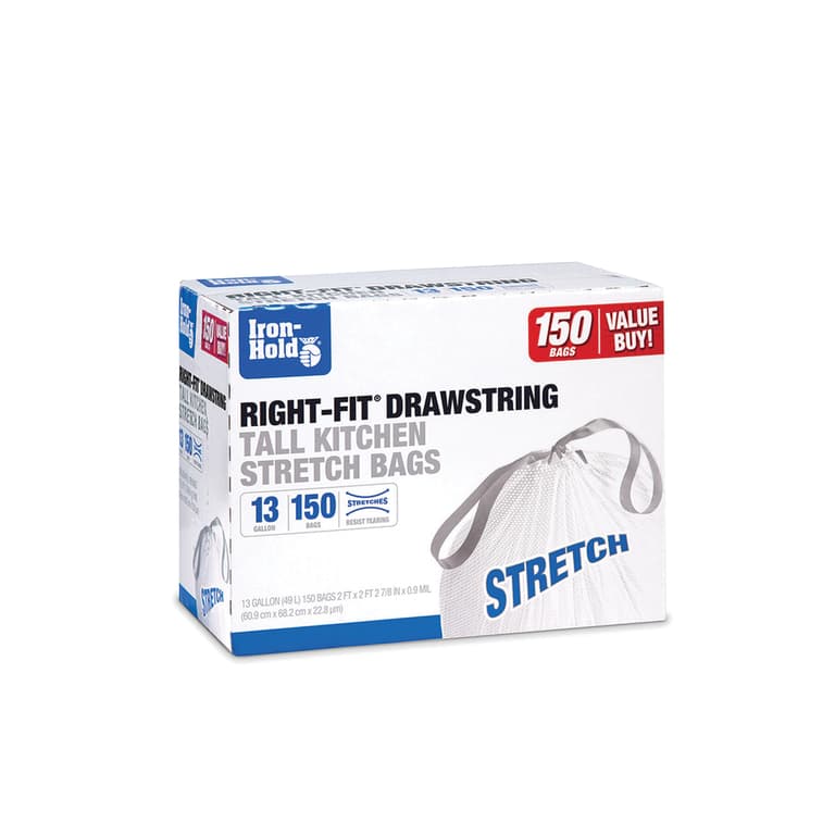 IRON HOLD TALL KITCHEN 13 GALLON TRASH BAGS WITH DRAWSTRING. 150 COUNT. RIGHT-FIT STRETCH.Specifications