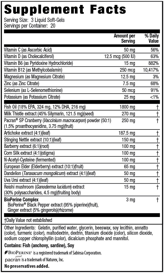 2-IN-1Kidney & Liver Super Cleanseis a high-powered whole-body cleansing formula designed for the health-conscious individual who is seeking robust 10-day detoxification support. This dynamic formula utilizes some of Nature’s most prized liver and kidney supportive botanicals to encourage detoxification and the removal of impurities by the kidneys and liver. Kidney Support - Stinging Nettle, Dandelion Leaf and Corn Silk Extracts are valuable botanicals used in traditional formulas that support the cleansing function of the kidneys. PACranSP is a powerful cranberry extract that has been clinically shown to support the health of the urinary tract while also helping to reduce urinary tract discomfort. Fish Oil, Zinc, Magnesium and Potassium help to support the kidneys as they take on a heavy work load. Liver Support - Our Milk Thistle delivers over 240 mg of Silymarin per day for optimal liver support. Artichoke, Barberry and Reishi Mushroom have a long history of traditional use in liver formulas. When combined with N-Acetyl-Cysteine (NAC) these nutrients give unparalleled support to the liver as it works to process accumulated toxins and impurities. Use periodically for intensive support to the body’s detoxification pathways.This product is not intended for ongoing daily use.Specifications