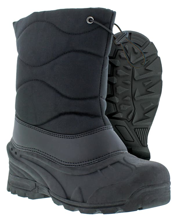ITASCA MENS SAMPSON SNOW BOOTS WILL PROTECT YOUR FEET FROM THE COLD WITH THE MI-TOP DESIGN TO HELP KEEP SOCKS AND ANKLES DRY, NYLON UPPER WITH WATERPROOF TPR SHELL AND AN ELASTIC BUGEE SNOW COLLAR