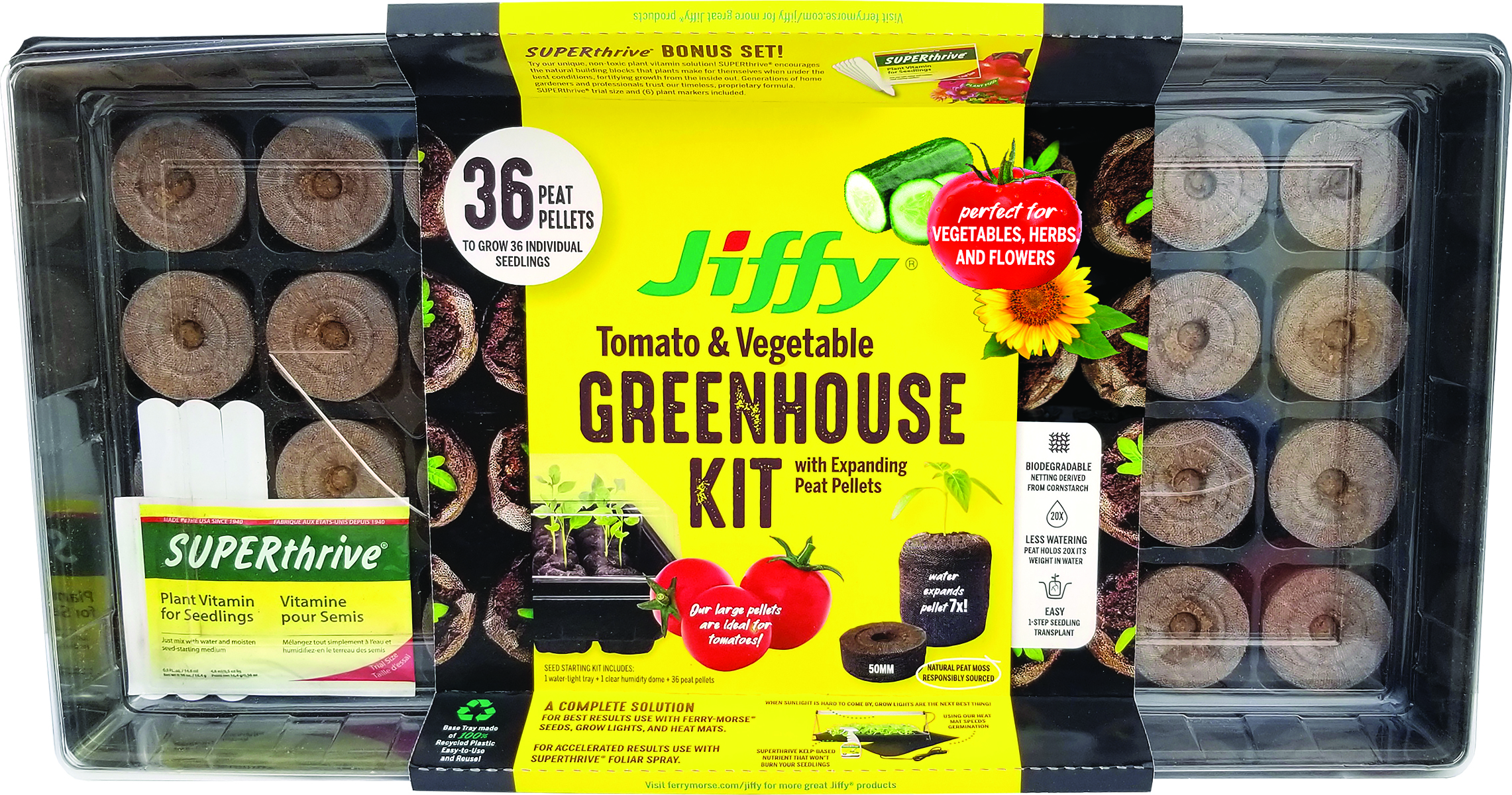 Ideal for tomatoes and grows up to 36 plants; Includes a bonus pouch of SUPERthrive, a plant vitamin for seedlings; Kit includes 36 large Jiffy 50 mm peat pellets, base tray and clear dome; Seed is not included so you can plant the variety you choose; Start seed early indoors