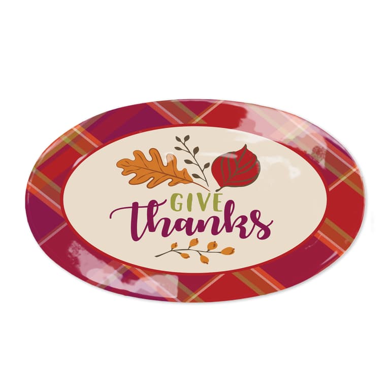 Serving platter in Fall colors with a "Give Thanks" motive and a plaid border.Specifications