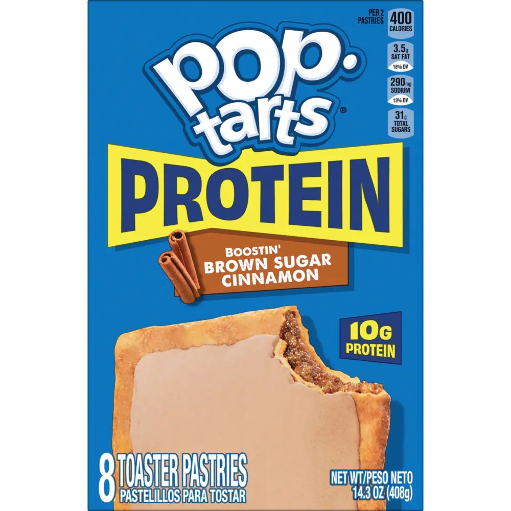 A travel-ready toaster pastry perfect for a lunch box or pantry snacks option; Enjoy straight from the pouch, warmed in the toaster, or microwaved; Good source of protein (11% daily value); Baked in the USA; No prep or mess; Enjoy as part of an easy breakfast, snack option, or dessert; Includes one 14.3oz box containing eight toaster pastries; four pouches total, two pastries per pouch; Shelf-stable and packaged for freshness; Soft toaster pastries with gooey brown sugar-cinnamon flavor filling, topped with sweet frosting; Protein snacking option for busy mornings or any time of day; Start your day with classic Pop-Tarts flavor and a boost of 10g protein (11% daily value); Crazy Good snack choice the whole family will love