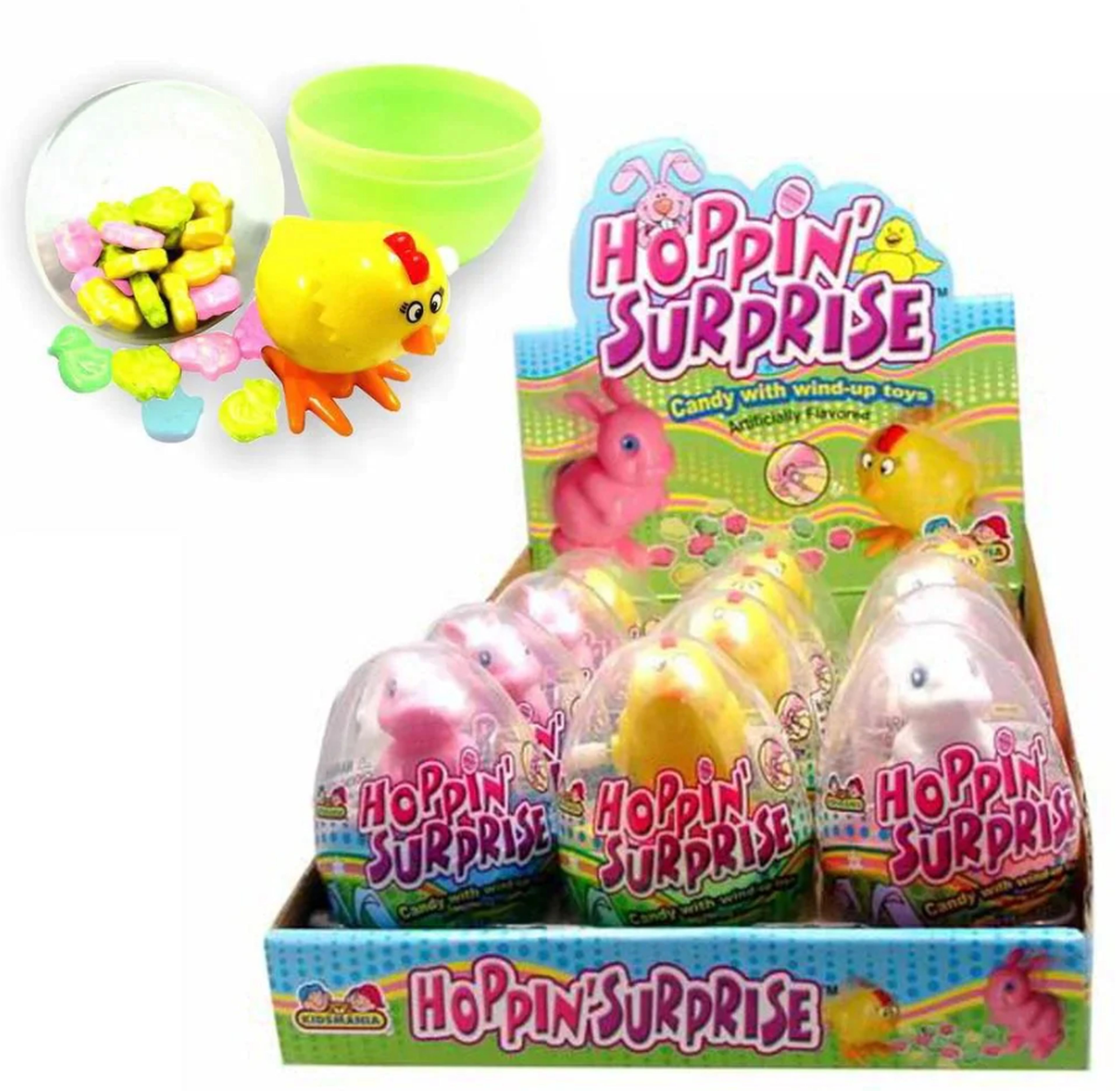 KIDSMANIA HOPPIN SURPRISE IS AN EXCITING EASTER THEMED TREAT THAT COMBINES CANDY WITH A PLAYFUL TOY. EACH EGG SHAPED SURPRISE CONTAINS A COLORFUL INTERACTIVE TOY THAT HOPS AND ADDS A FUN ELEMENT TO THE CANDY EXPERIENCE. THESE WOULD BE THE PERFECT ADDITION TO YOUR EASTER CELEBRATIONS.Specifications