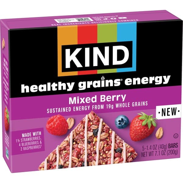 Discover all kinds of good in every bite of KIND Mixed Berry Healthy Grains Energy bars. If you love delicious fruit flavors, these are for you! Our gluten free snacks combine dried berries with five super grains: oats, millet, buckwheat, amaranth, and quinoa for Sustained Energy from whole grains. Non-GMO Project Verified with 19g whole grain per serving, each bar is made with 1-1/2 strawberries, 4 blueberries, and 2 raspberries, and has a chewy yet satisfyingly crunchy texture. With 0g trans fat, low sodium, and no sugar alcohols, these bars are a good source of fiber (5g fat per bar), so you never have to choose between what tastes good and feels good. Whether you're running errands, packing lunch box snacks for kids, craving a late-night bite, or want tasty on the go snacks, these snack bars are a quick and wholesome food option. Real ingredients deliciously combined - that's KIND! Contains five bars. Based on average fruit sizing data provided by USDA FoodData Central.Specifications