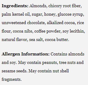 Dark Roast coffee and whole almonds blended with honey and drizzled in dark chocolate to form a bar; Only tastes indulgent; With just 5g of sugar