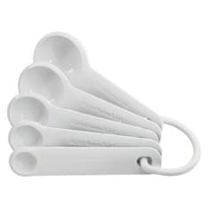 BOTH WET AND DRY; CLEARLY MARKED MEASUREMENTS; INCLUDES 1 TABLESPOON, 1/2 TABLESPOON, 1 TEASPOON, 1/2 TEASPOON, 1/4 TEASPOON; SET OF 5 MEASURING SPOONS; WHITE PLASTIC