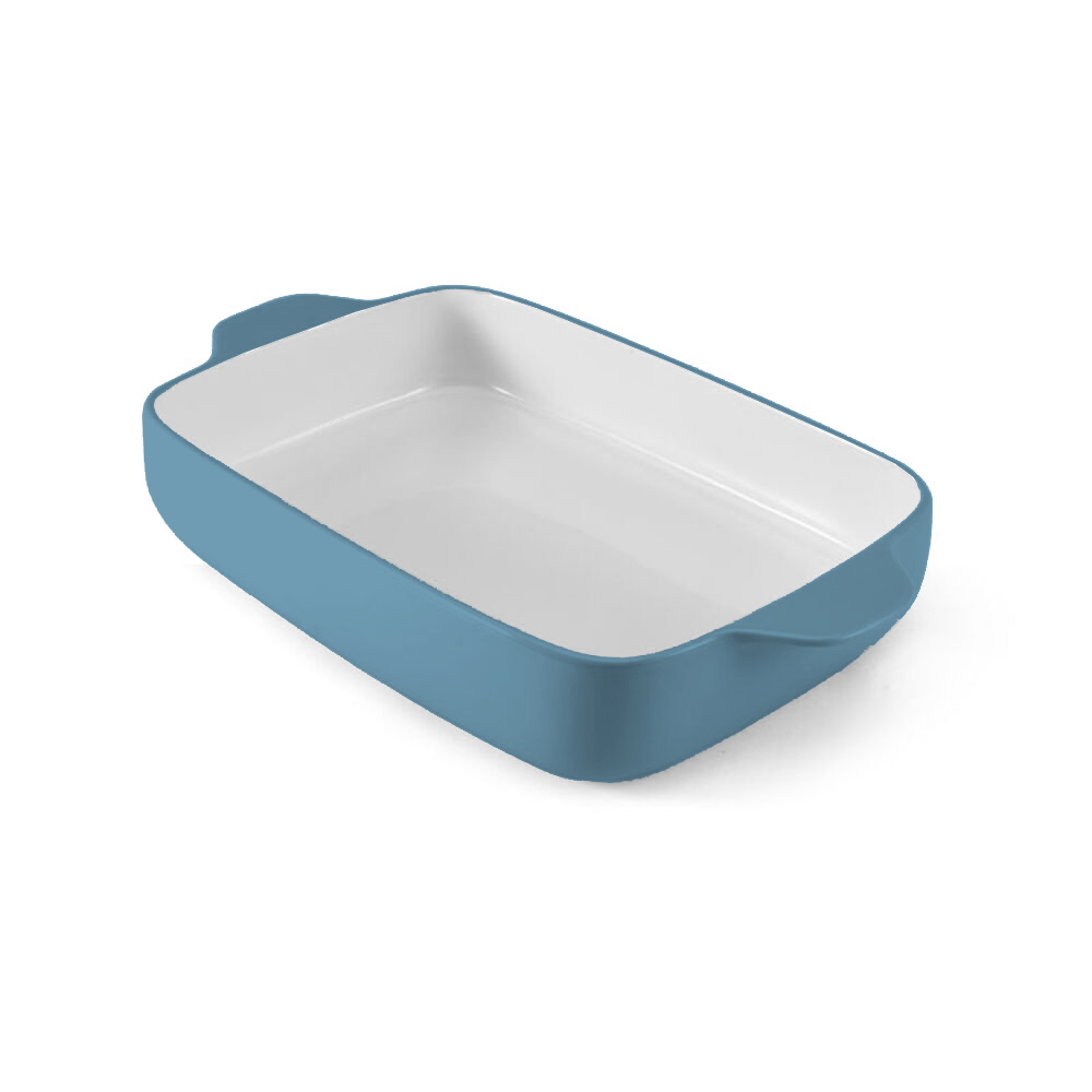 4 1/2 QUART CAPACITY; AMPLE HANDLES FOR BAKING AND SERVING; BLUE VELVET; DISHWASHER SAFE; OVEN FREEZER AND MICROWAVE SAFE; RECTANGULAR VITRIFIED STONEWARE BAKER; SUPERIOR DURABILITY