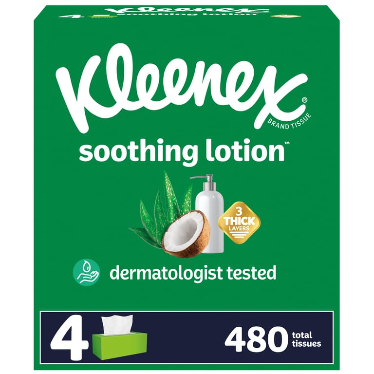 Kleenex Soothing Lotion Facial Tissues feature 3-in-1 skin-loving benefits that help protect hands with 3 thick layers, soothes with dermatologist tested gently touch, and nourishes skin with gentle moisturizers. Whether you need Kleenex tissue boxes for the house or the office, with Kleenex Soothing Lotion Facial Tissues, you get 4 flat boxes of 120 tissues, so you have plenty of tissues for everyone. When you’re not feeling well, the simplest things can matter mostupgrade your cold and flu care or allergy routine with Kleenex Soothing Lotion Facial Tissues. One tissue of Kleenex is all it takes and helps protect hands better with three thick layers during cold and flu season. Plus, our tissues are dye and fragrance free. Find a tissue box that fits your home because each pack contains various colors and designs. 100% of our pulp is from responsibly managed forests.Specifications