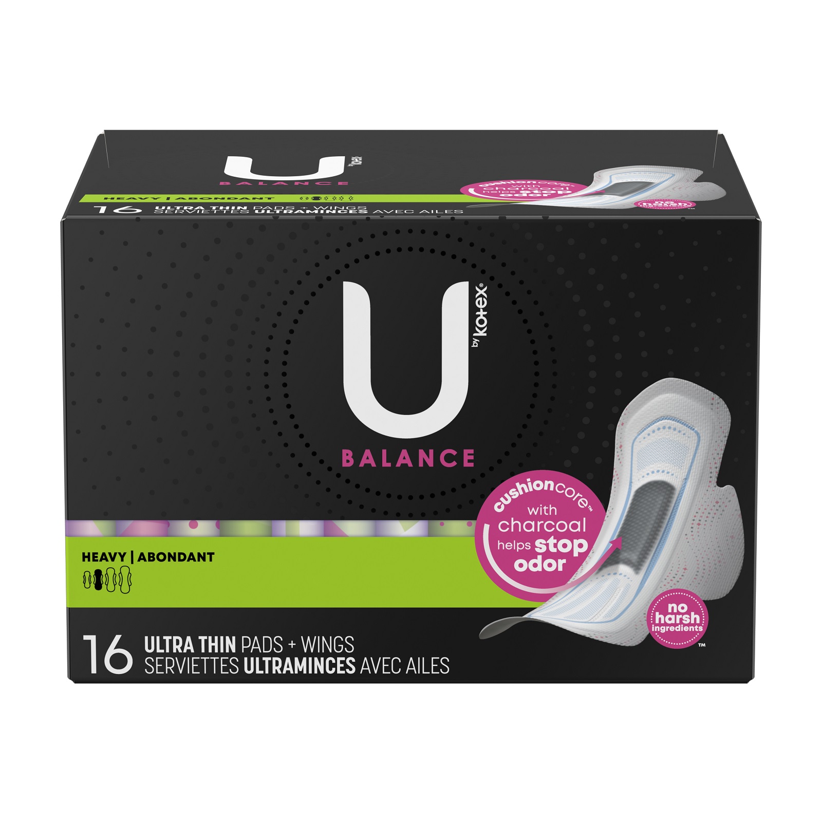 Give yourself a period pad that’s designed to keep up with you and your day with the U by Kotex Balance Ultra Thin Pads with Wings. These sanitary pads feature U by Kotex's CushionCore that not only absorbs instantly for up to 100% leak-free protection, but also is infused with 100% plant-based charcoal to help stop odor. Plus, U by Kotex's unscented pads are dermatologist-tested, contain no harsh ingredients, and are made without pesticides, fragrances, lotions, natural rubber latex, and elemental chlorine. With up to 10 hours of protection, the comfort of our sanitary pad allows you to focus on your day; not on your period. The design fits and flexes with your body to deliver outstanding skin comfort while the wings keep the pad in place. U by Kotex's feminine pads are individually wrapped in vibrant colors and patterns, so you can take them with you wherever you go. For overnight protection in any sleep position, try U by Kotex Balance Ultra Thin Overnight Pads.Specifications