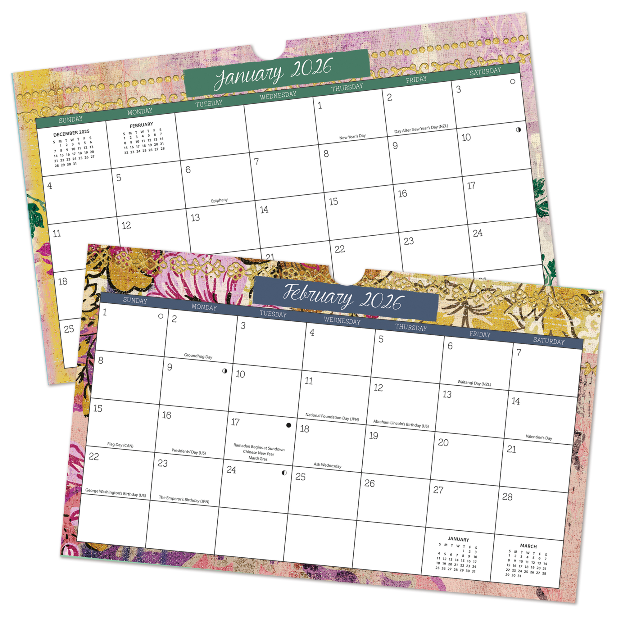 12-month format (January - December 2026); Full-color artwork and design throughout; Includes 2 note pads and 1 sticky note pad; Product Size: 12"w x 12.125"h x 0.46"d; Standard metal hanger plus optional magnetic strip