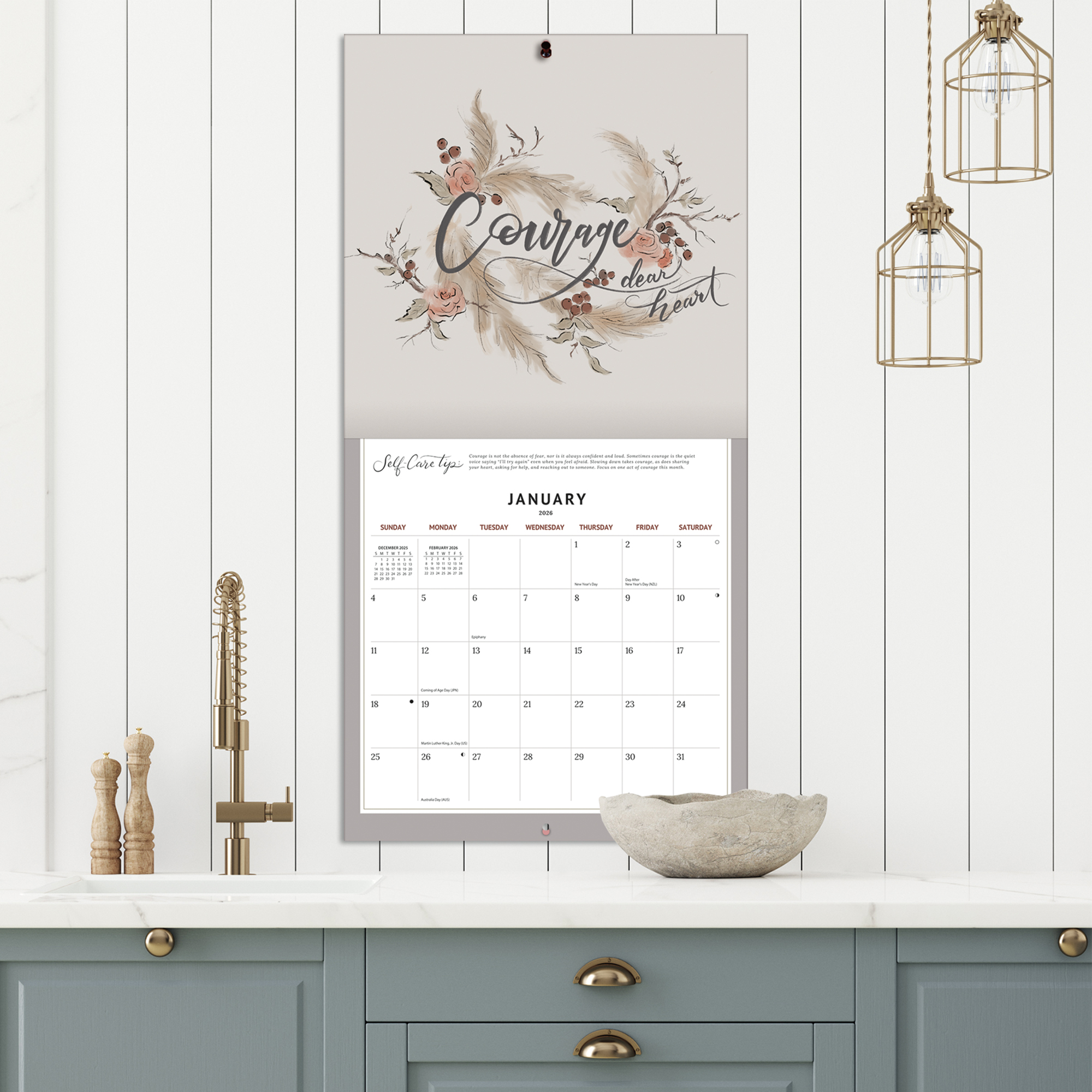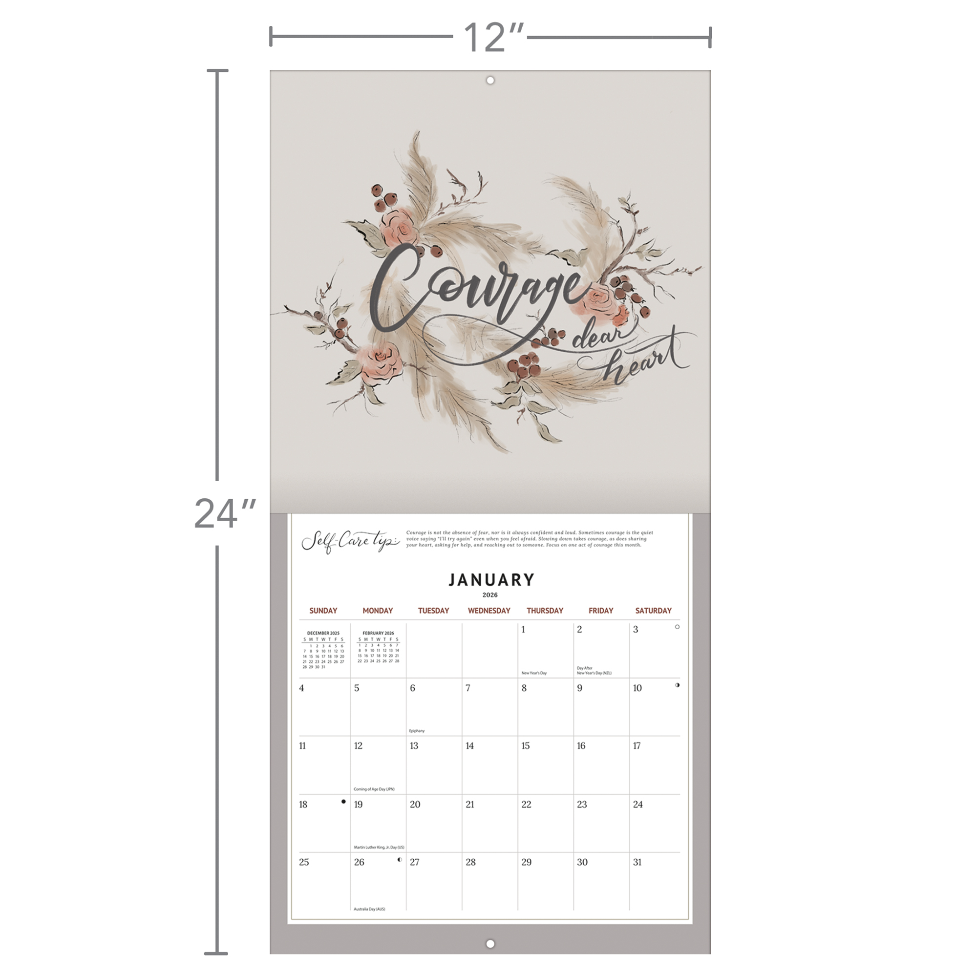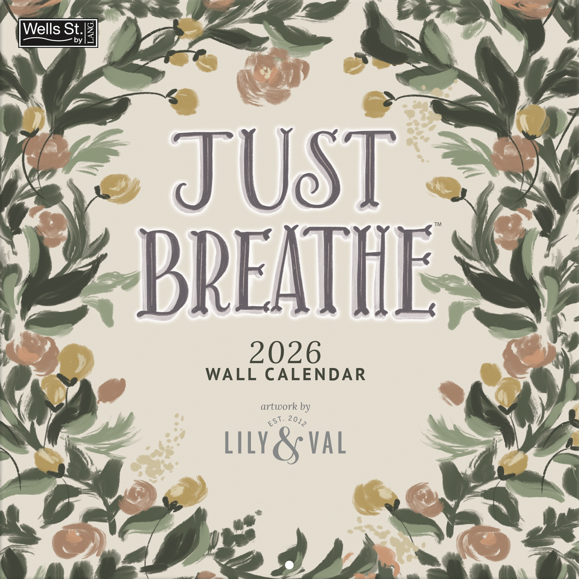 The Just Breathe 2026 Wall Calendar features monthly inspirational and hopeful artwork by Lily & Val, with a self-care tip featured each month. Wells St. by LANG Wall Calendars feature monthly full color images based on hand-painted originals, elegant linen-embossed paper stock, and a brass grommet for hanging.Specifications