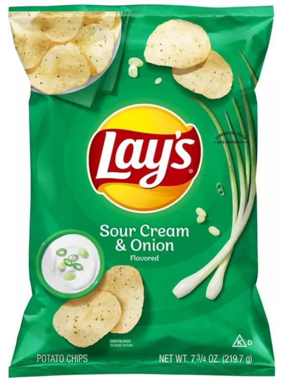 Delicious snack; Potato chips; Sour cream and onion flavor