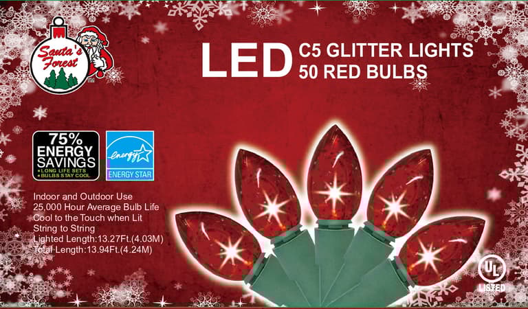 LED C5 GLITTER LIGHTS 50 RED BULBSSpecifications
