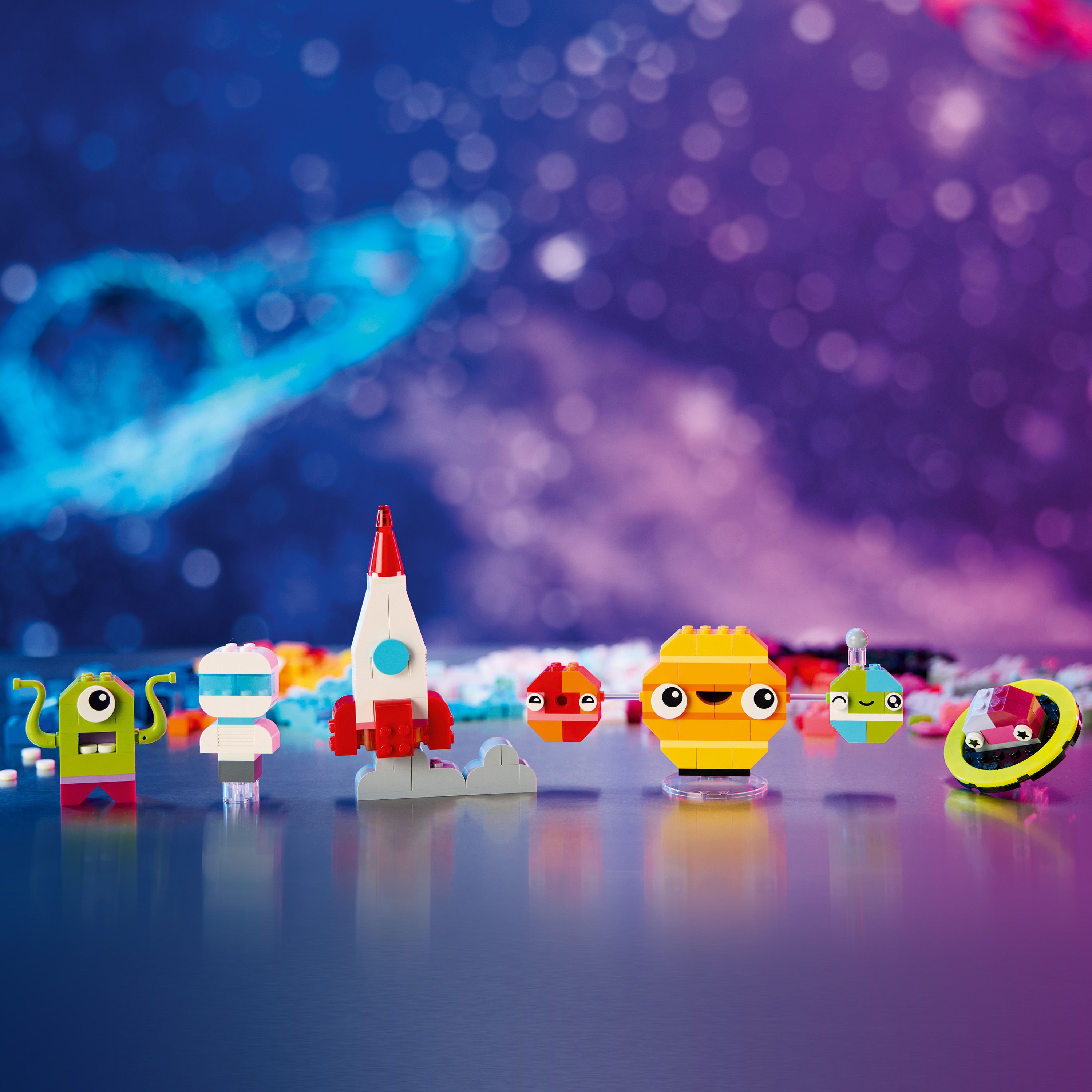 Blast off into space with 5 easy-to-build models: a smiling solar system, space rocket, funny alien, awesome astronaut and Saturn with its famous rings. Give your models a boost with bright colors and glow-in-the-dark bricks. Then, before you come back down to Earth, check out 10 new ideas for the most out-of-this-world creations in the universe!Specifications
