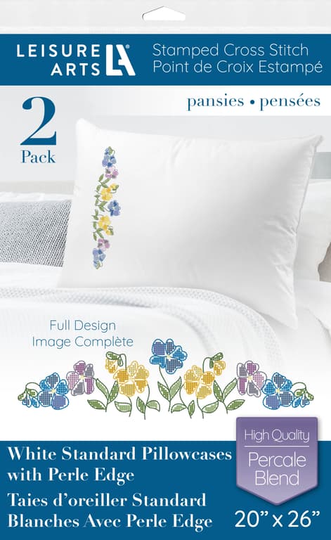 Leisure Arts Stamped Pillowcases With Perle Edges are printed on high quality percale woven fabric with 51% cotton and 49% polyester. Stamped pillowcases add the perfect personal touch to your room. Includes 2 pillowcases. Edging is narrow with loops on both sides and can be finished in a variety of ways. Includes stitch chart, diagrams and recommended floss colors for DMC, Anchor and Coats. Printed ink can be washed out after stitching. 20"x 26" Pansies 2pc- Stamped cross stitch designs feature a variety of pansy flowers aligned vertically on the left side of the pillowcase. Standard style with an opening on one end.Specifications