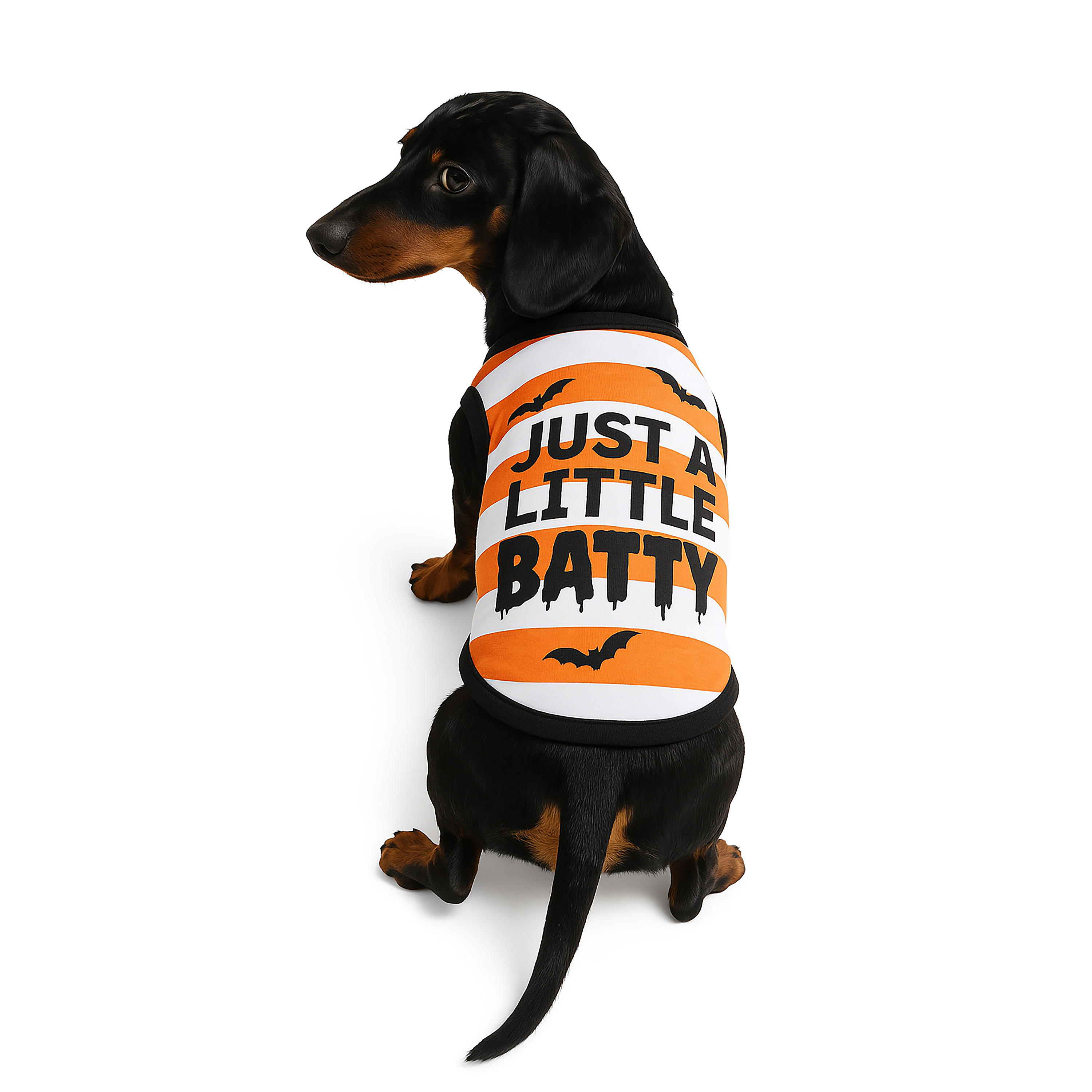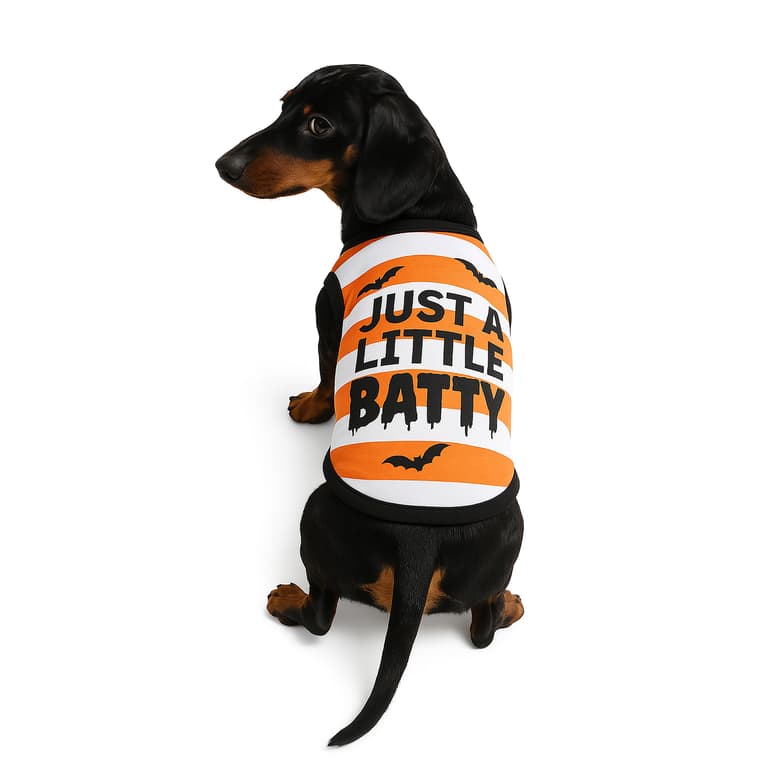 "Just A Little Batty" logo; Crew neck; Leash hole opening; Trim edged hem and collar