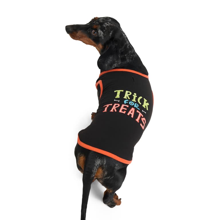 "Trick or Treats" logo; Crew neck; Leash hole opening; Trim edged hem and collar