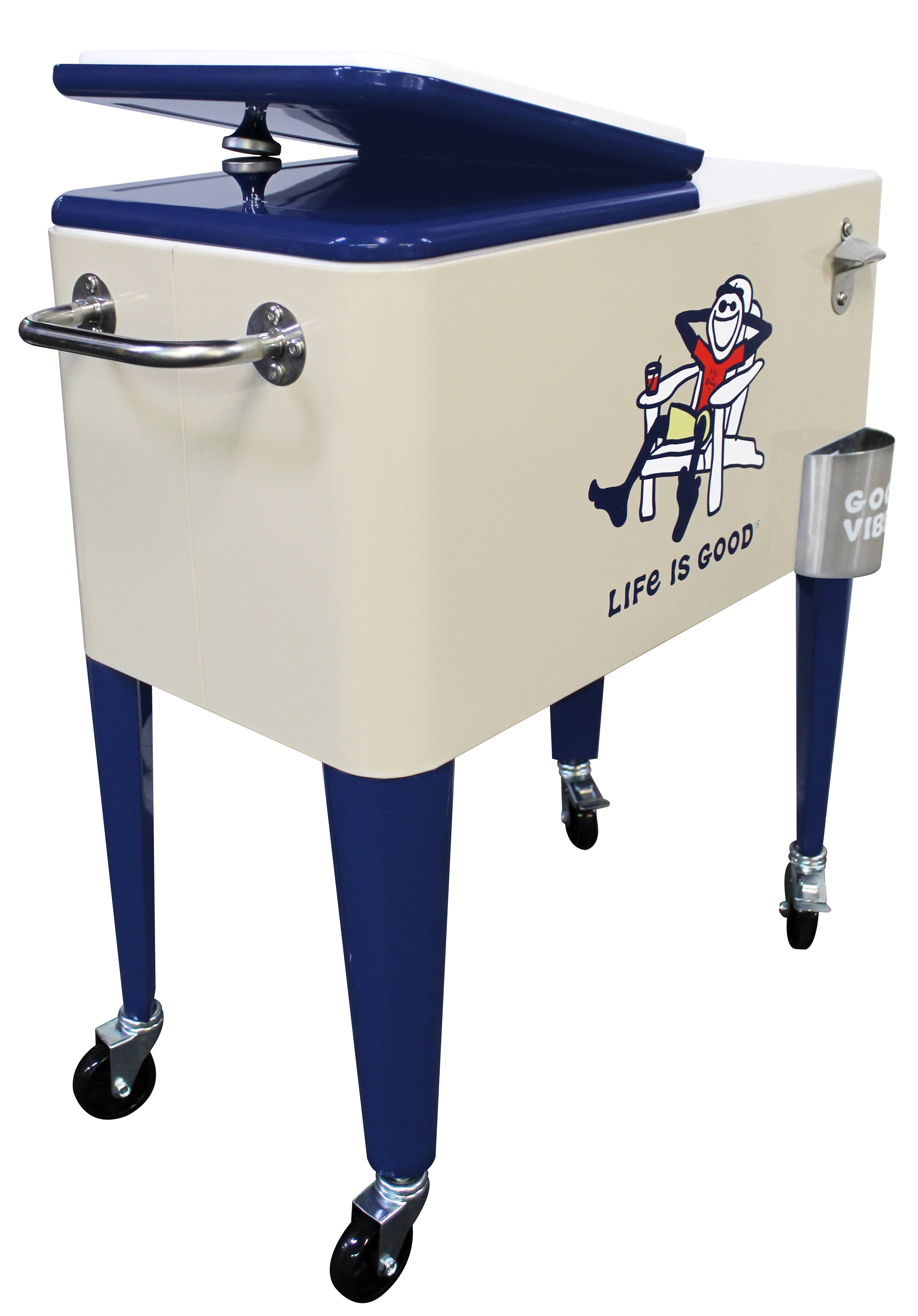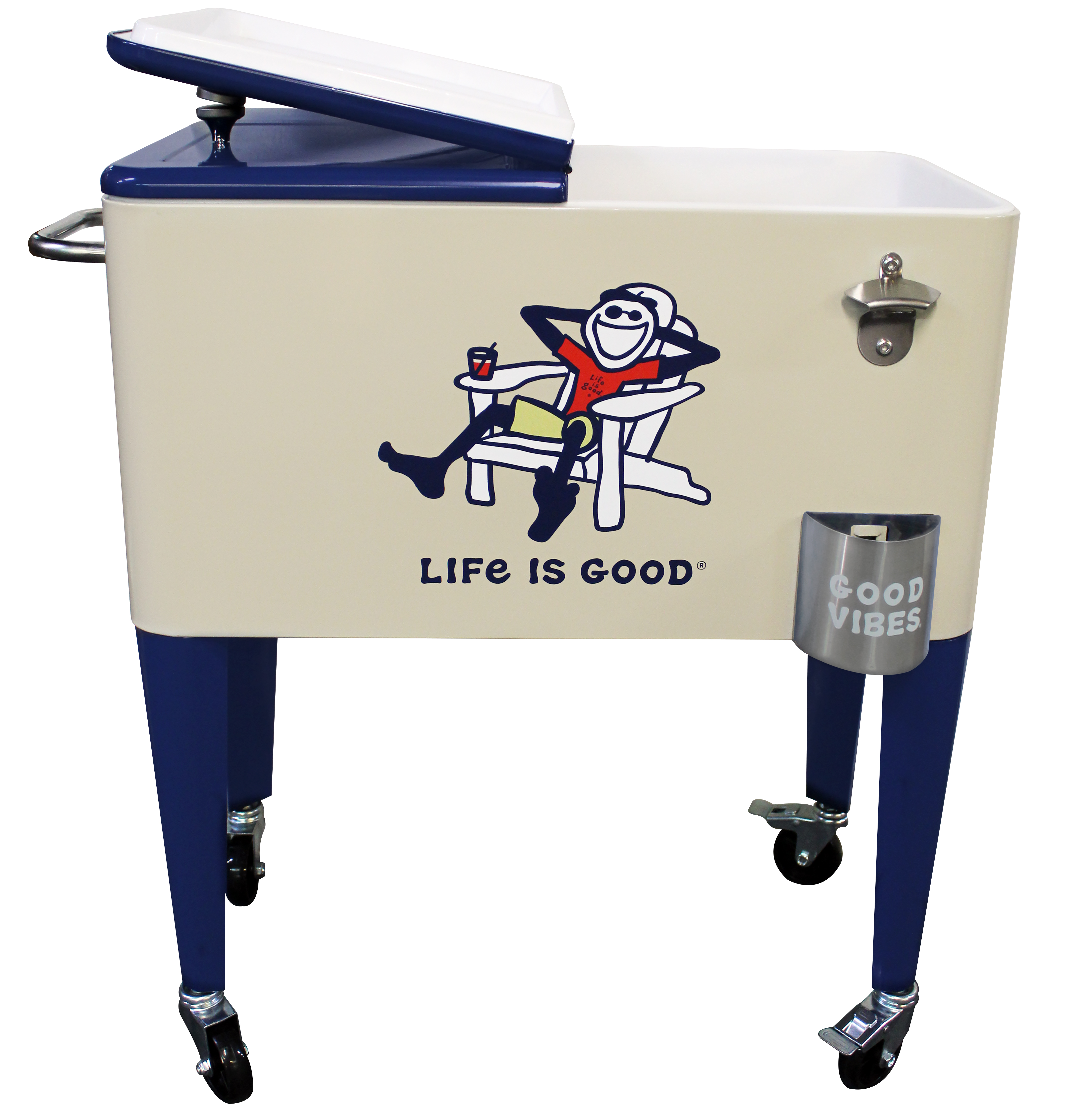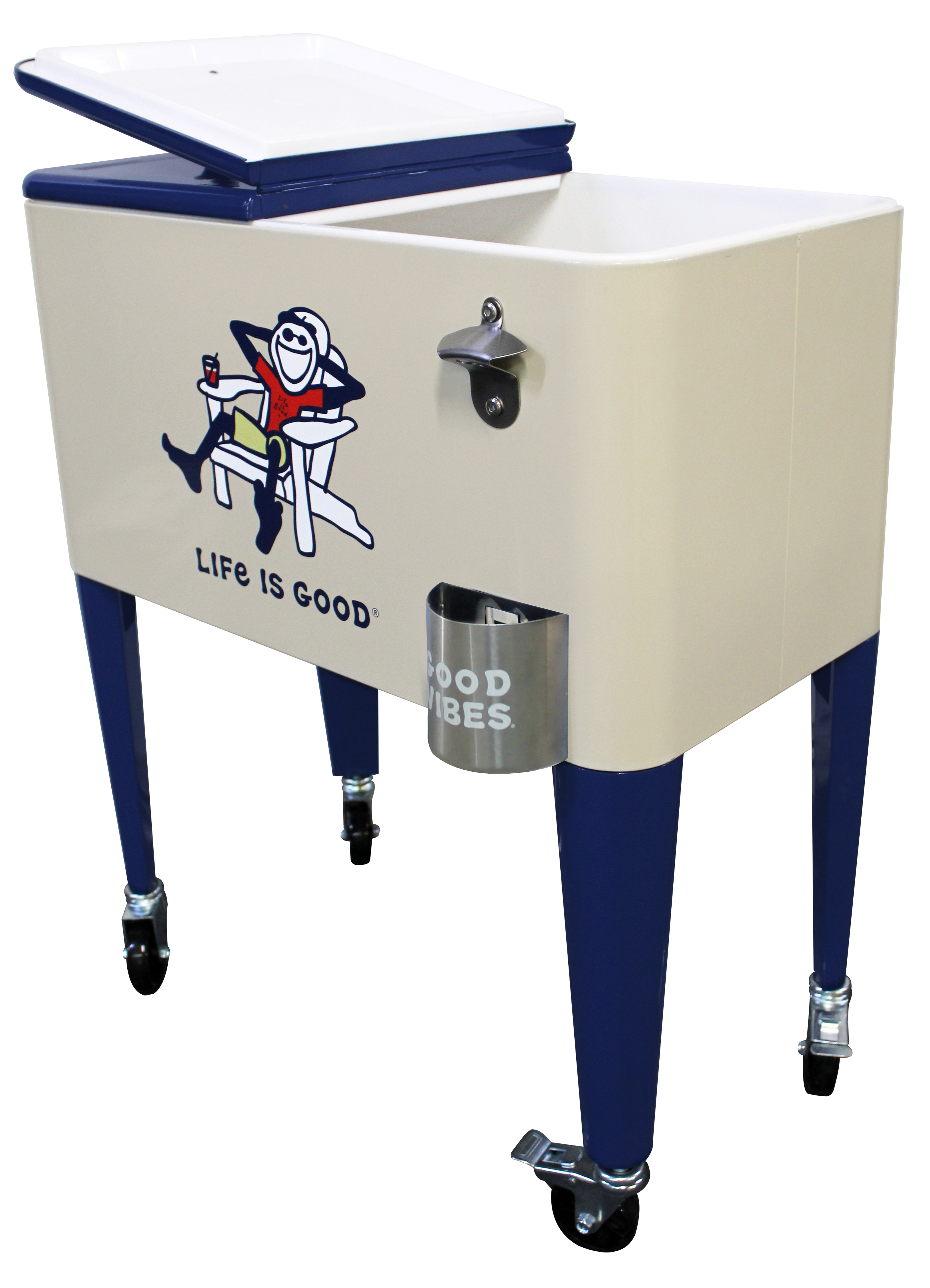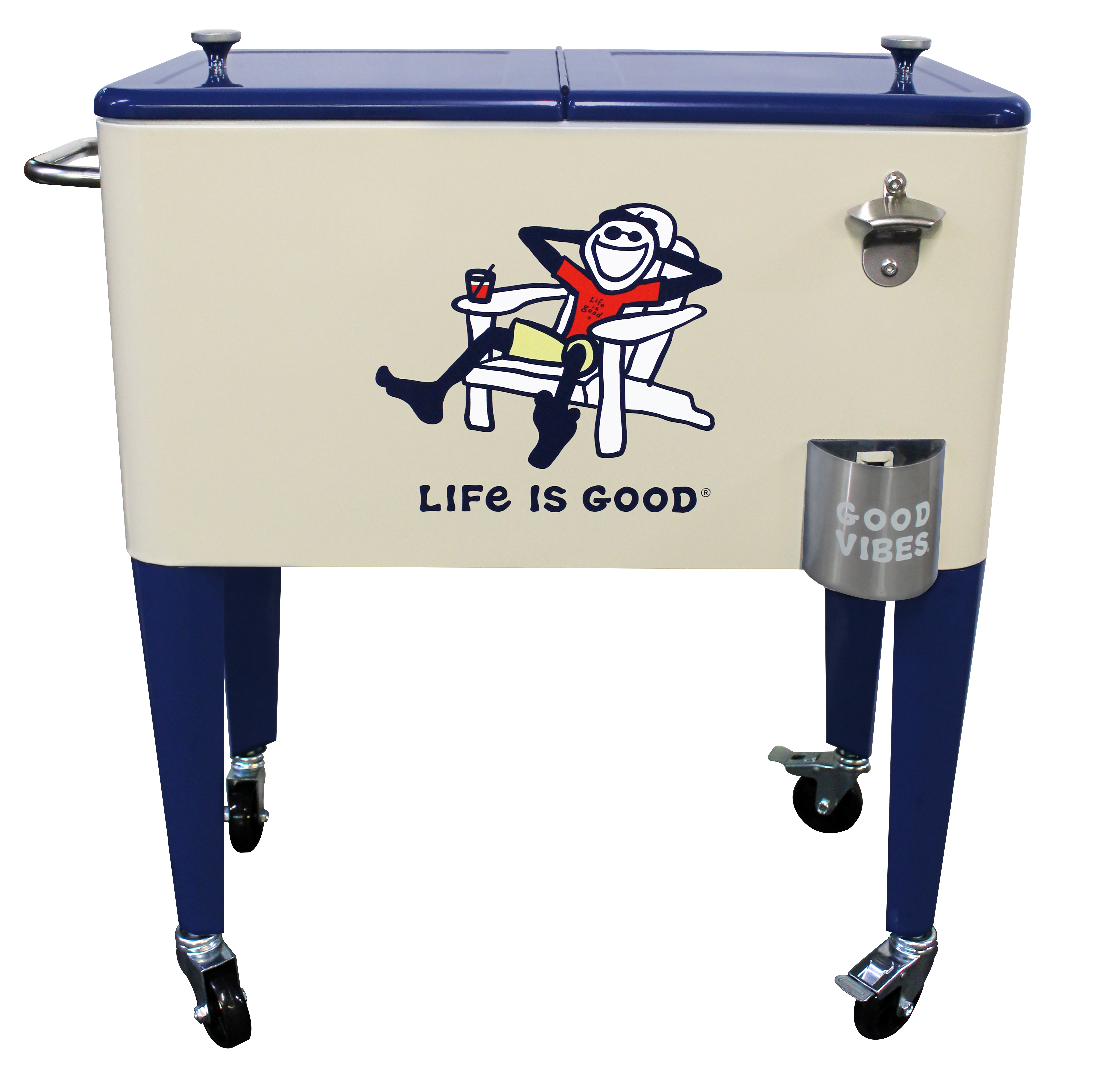 Three simple words: Life is Good! Let the good times roll with the officially licensed Life is Good Vintage Adirondack Jake 60 quart rolling cooler. Perfect for storing and serving drinks and good vibes at your next party. The removable double lid and insulated liner allows for up to 70 cans or bottles. Attached is a convenient bottle opener, lid catcher and side handle for towels and maneuvering for easy entertaining. Official Life is Good Vintage licensed product. spreading good vibes since ’94.Specifications