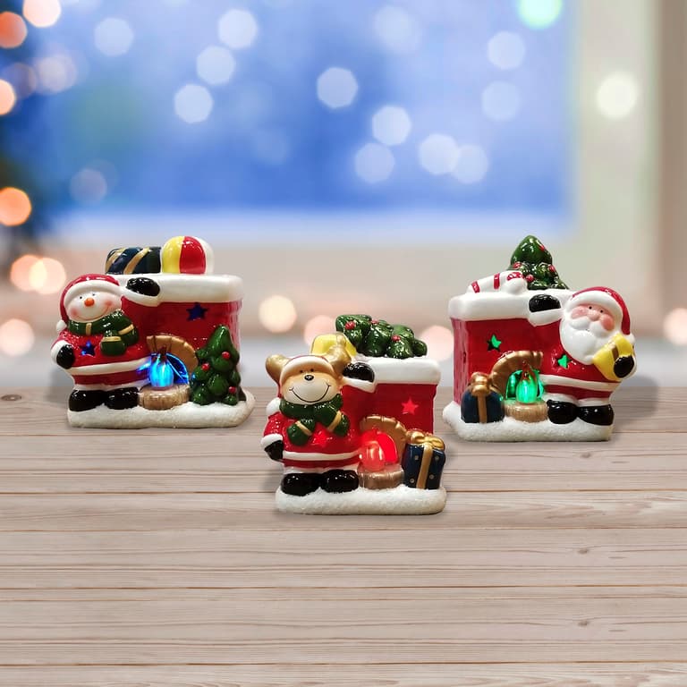 These charming holiday figurines feature a Santa, Reindeer, and a Snowman next to a fireplace with color-changing LED lights. The battery-operated holiday decor brings a joyful atmosphere to your indoor living space (batteries included). Display it on your mantel, table or anywhere you want to add a whimsical holiday accent. Each timeless and charming holiday figurine measures 4"L x 3"W x 5"H and is made of ceramic with a beautiful glossy finish. It also includes a one-year manufacturer's warranty from the date of purchase.Specifications