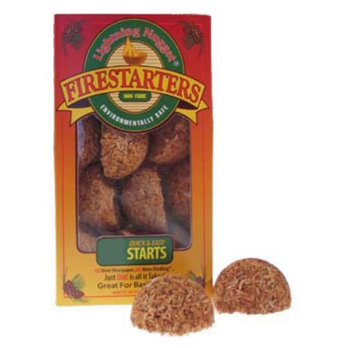 Lightning Nuggets fire starters, for quickly starting any fire indoors and or out, non-toxic and environmentally safe; pine scented; unlimited shelf life, made of pine wood and food-grade wax, no residue left behind, only 1 needed; no need for messy newspaper and kindling, replaces the need for messy volatile lighter fluids or gels. Great for ceramic cookers and pizza ovens.Specifications