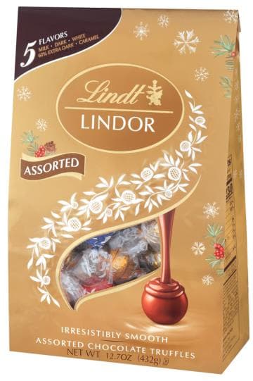 EXPERIENCE SMOOTH MELTING CHOCOLATE INDULGENCE IN LINDT LINDOR TRUFFLES. THESE CHOCOLATE TRUFFLES MAKE EVERYDAY FEEL LIKE CHRISTMAS WHETHER YOU ARE TAKING A MOMENT TO YOURSELF OR SHARING WITH OTHERS. THIS HOLIDAY LINDT LINDOR BAG FEATURES FOUR TRUFFLE FLAVORS THAT INCLUDE MILK CHOCOLATE DARK CHOCOLATE WHITE CHOCOLATE AND CARAMEL MAKING THIS THE PERFECT BAG TO SHARE WITH YOUR FRIENDS AND FAMILY THIS HOLIDAY SEASONSpecifications