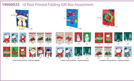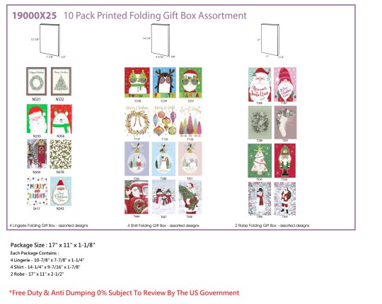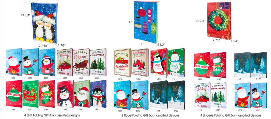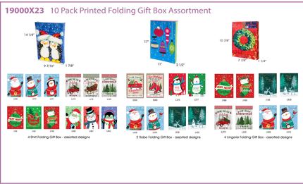 Selections Varies for Online Orders Value Pack 10Pk Printed Folding gift boxes. Each Package Contains: 4 Lingerie - 10-7/8" x 7-7/8" x 1-1/4"4 Shirt - 14-1/4" x 9-7/16" x 1-7/8", 2 Robe - 17" x 11" x 2-1/2"Specifications