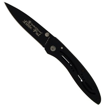 Black titanium powder coated blade and handles. 3" closed framelock. 440C stainless drop point blade with ambidextrous thumb studs. Skeletonized stainless handles. The Smith & Wesson Little Pal CKLP is an ultra thin folder for pocket carry. It sports a stainless steel frame lock handle with decorative cut-outs on front and an open build for easy cleaning. The Little Pal has dual thumb studs, sized for easy one-hand opening. This CKLPB model features a black finished blade and handle.Specifications:- Knife Type: Folding- Blade Material: 7Cr17- Blade Style: Drop Point- Finish: Black- Edge Type: Plain- Handle Material: Stainless Steel- Color: Black- Lock Type: Frame Lock- Blade Length: 2.28"- Handle Length: 3.03"- Overall Length: 5.31"- Weight: 0.06 lb.Specifications