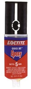 LOCTITE-Quick Set Epoxy. This epoxy adhesive sets clear in 5 minutes and bonds wood, metal, ceramic, glass, most plastics and tile. It has a high strength and water/solvent resistant bond. The dual syringe means the perfect measurements with no mixing. This package contains 0.85oz/25ml.Specifications