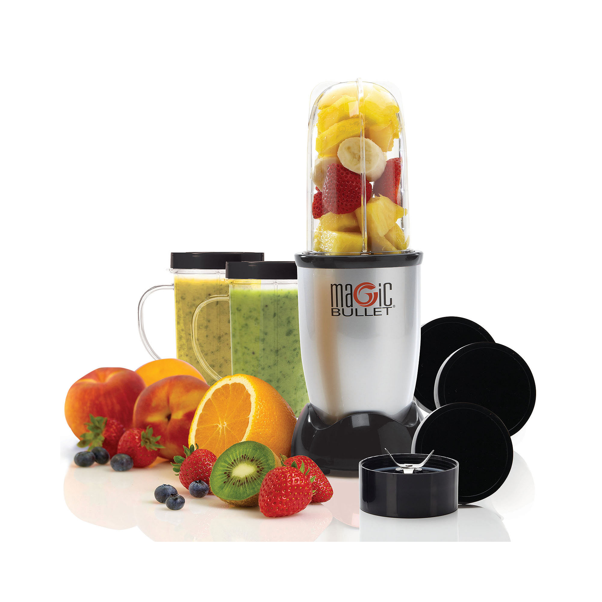 Magic Bullet 11-Piece Set. Hi-speed blender & mixer. Handy versatile and easy to use the Magic Bullet Blender & Food Processor takes up minimal counter space while showcasing maximum speed and versatility. With its unique design and compact size the Magic Bullet Blender & Food Processor chops mixes blends whips grinds and more in less time than it takes to assemble standard kitchen appliances. Make the perfect smoothies and milkshakes frozen cocktails and pureed soups super easily! And with a wide array of dishwasher-safe attachments clean-up is as easy as it gets. The secret to the Magic Bullets time-saving efficiency is its specially designed blade and unique bullet shape. These features work together to quickly and forcefully circulate food back into the Cyclonic Cutting Zone allowing the Magic Bullet to do virtually any food prep task in seconds. 10 second recipe book included.Specifications