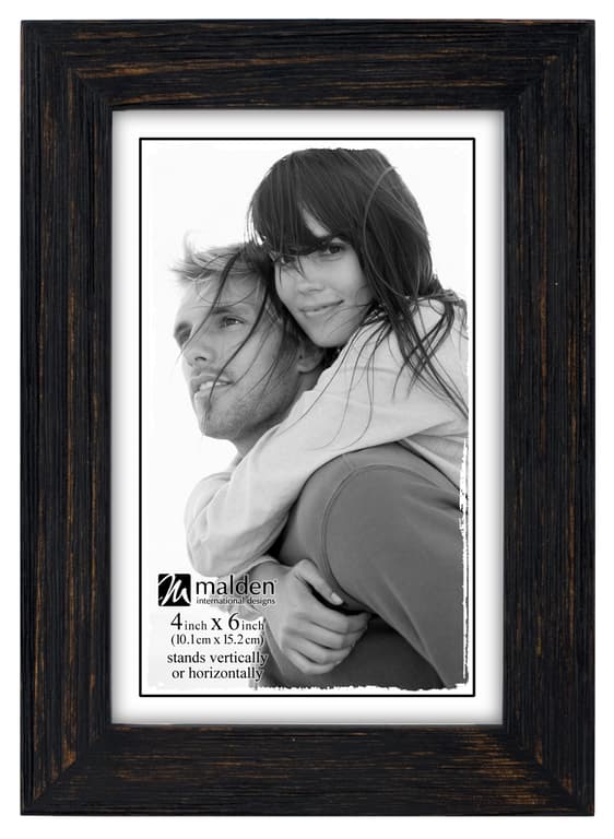 Showcase your rustic style with this rough black linear picture frame from Malden Int Designs. With it’s simple and elegant design, this stunning frame is the perfect way to display your favorite photos or art prints. Frame is constructed of sturdy MDF wood with a smooth finish. This frame holds a 4 x 6 inch photo in a 3.5 x 5.5 inch display open- ing. An easel back allows for horizontal or vertical on any tabletop or shelf. Hardware on the back makes it easy to hang on a wall. A durable glass front will protect and show- case your precious memories for years to come. Simple to load with high quality turn tabs and a sturdy back panel. This understated design makes it perfect for fine art or for your favorite memories. This classic frame makes a great gift for birthdays, holidays and more.Specifications