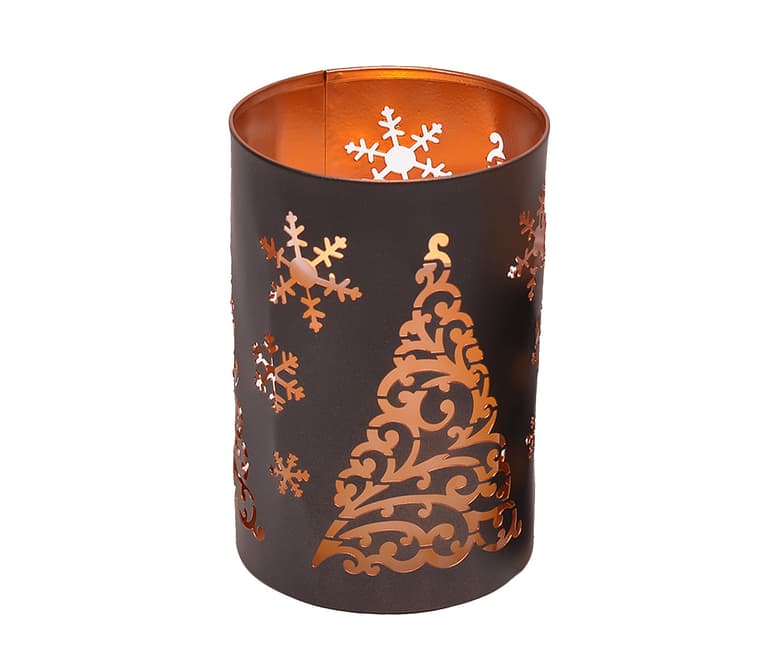 Light up your home for the holidays with our 6-inch Black and Gold Metal Flameless LED Tree Luminary. Featuring a built-in, 6-inch x 4inch battery-operated Flameless LED Pillar, the Tree Luminary provides a safe, beautiful glow without the hazards of an open flame or melting wax. As a bonus, our luminary includes an automatic timer, that when set, conveniently turns the pillar on at the same time every day for 6 hours and off for 18 hours.Specifications