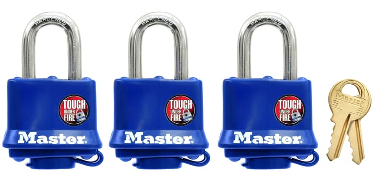 Four-pin cylinder and dual ball bearing locking mechanism provides maximum pick and pry resistance; Includes three padlocks two keys; Key padlock is constructed with laminated steel body and a hardened steel shackle for strength and security; Outdoor padlock with key features a blue weather resistant thermoplastic shell that provides outdoor protection against moisture dirt & grime
