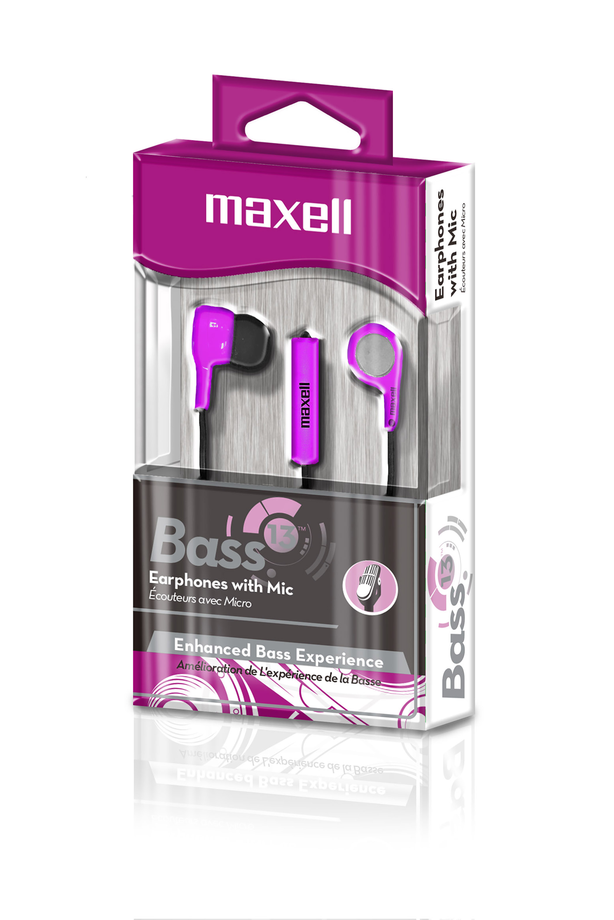 The purple Maxell 199730 Bass 13 Heavy Bass In Ear Earbuds with Microphone are designed with a copper coil added to the driver to increase the bass response. This helps deliver crystal clear highs a full-range of mids and vocals and a dynamic heavy bass sound. Theres also an in-line microphone for making and taking calls.Specifications