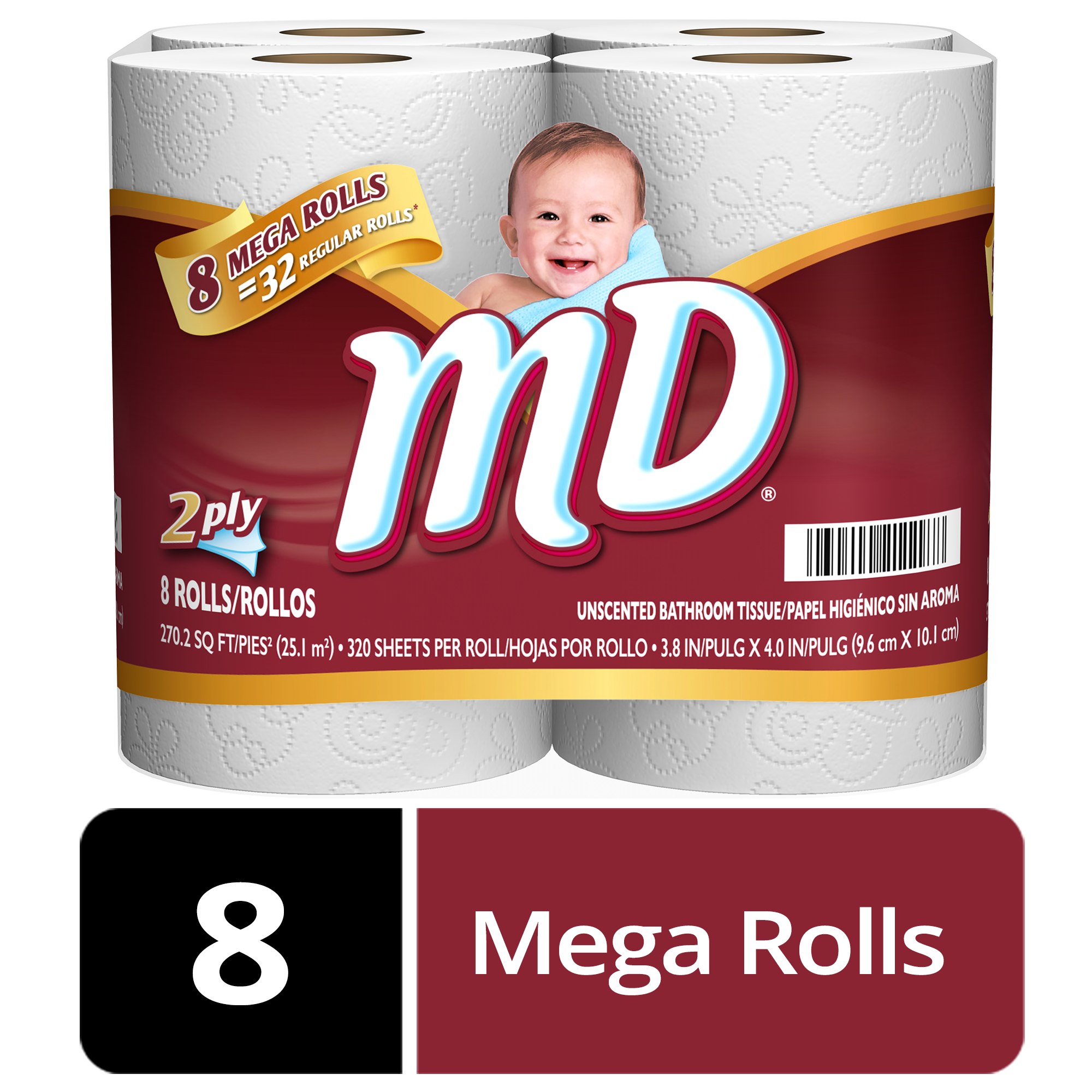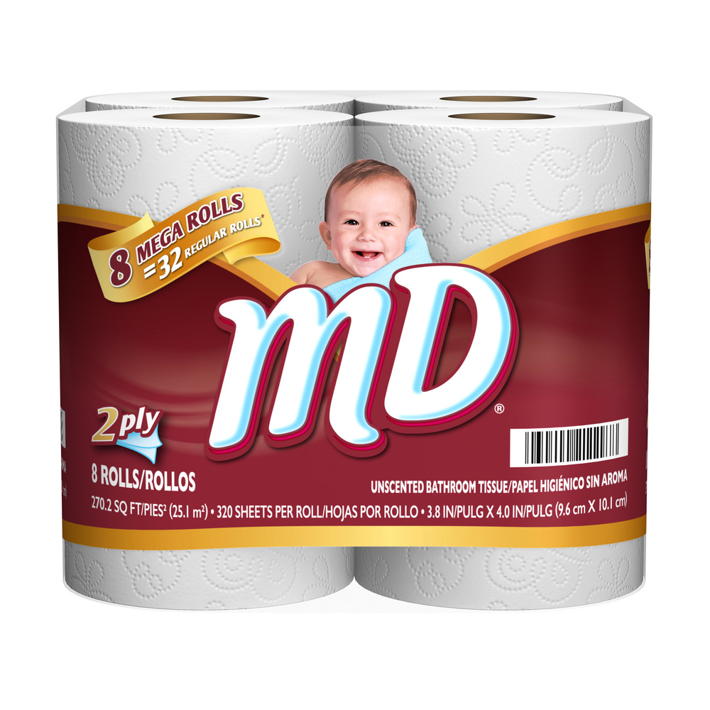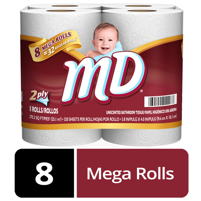 8 mega rolls 32 regular rolls; Designed with both softness and strength at a price that you’ll love; Flushable and safe for standard septic and sewer systems; Long lasting rolls with 320 2-ply sheets per roll; Try Our Thickest Mega Ever! Now 20% thicker sheets
