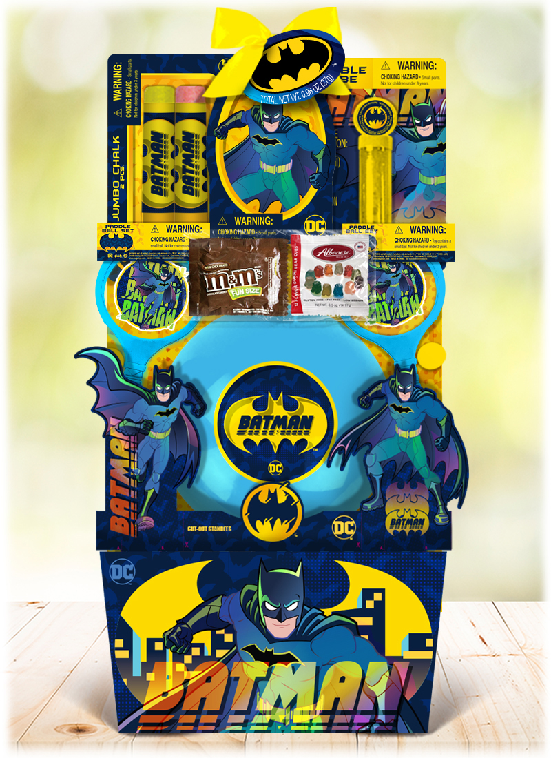 MEGATOYS EASTER BOX IS THE BEST OF BOTH WORLDS WITH ITS ASSORTED CANDY AND FUN ACTIVITIES. THIS SET COMES WITH CHALK, STICKERS, A PADDLE BALL, A PLAYBALL, A BUBBLE TUBE AND SOME ASSORTED CANDIES IN A FUN BATMAN THEMESpecifications
