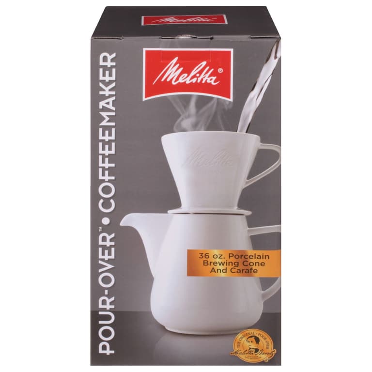 The Melitta 6-Cup Porcelain Pour-Over Coffeemaker & Carafe Set delivers a classic, handcrafted coffee experience with premium materials and timeless design. This set includes a 36oz porcelain carafe and matching porcelain brewing cone, both crafted for optimal heat retention and durability, plus a starter supply of Melitta #4 cone filters for immediate use. The manual pour-over method gives you complete control over brewing speed and extraction for rich, flavorful coffee every time. With dishwasher-safe components and an elegant, all-porcelain build, it’s perfect for home kitchens, entertaining guests, or as a stylish second pot.Specifications