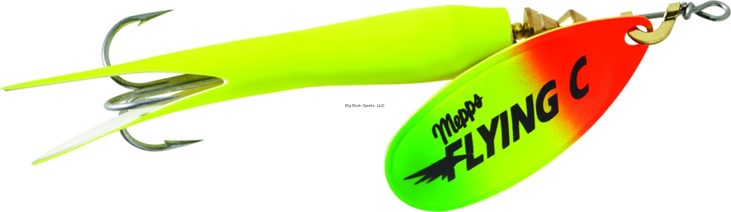 Mepps Flying C Spinners are heavyweight lures perfect for salmon and steelhead anglers but are a great addition to any angler's arsenal. These spinners cast like a bullet, get into the strike zone quickly, and run deep throughout the retrieve. Bright fluorescent sleeves provide attraction, while the variety of blade colors provide enticing flash.Specifications