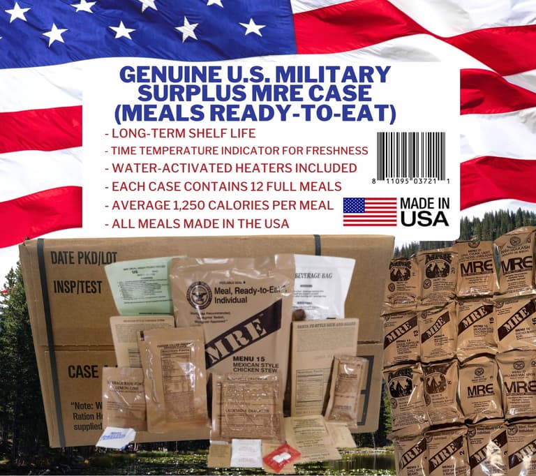 These are genuine military standard Military MRE cases and are intended to last for extended periods of time. Each Military MRE case is stamped with all applicable dates and have a Fresh-Check Indicator on each box, ensuring they have been properly stored and maintained for the longest possible shelf life.Military Standard MREs are a primary source of nutrition for our men and women serving in uniform typically deployed in the harsh conditions of a field environment. They also serve as an expedient and complete meal for any general outdoors man, hiker, or emergency prepper. Menu options may vary slightly from what is listed as the military contractors have flexibility in what is placed in each case.Specifications