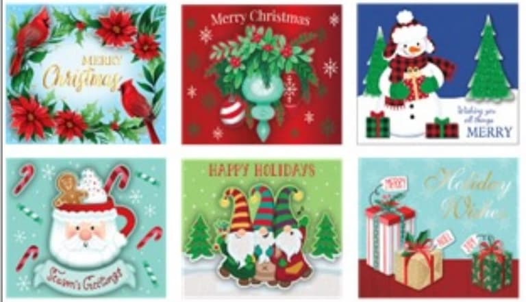 10ct Mini Cards 4-Assorted Designs: Cardinals; Ornament; Snowman; Santa; Gnomes & PresentsSpecifications