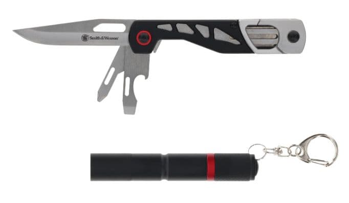 SMITH & WESSON LOCKABLE KNIFE WITH MULTIPLE TOOLS BUILT INTO THE HANDLE. STAINLESS STEEL FINE EDGE BLADE WITH BLACK STAINLESS STEEL HANDLES FOR DURABLITY. MULTI-TOOL INCLUDES CROSS & FLATHEAD, SCREWDRIVER, & HEX WRENCH, BOTTLE OPENER. ALSO INCLUDED IS A KEYCHAIN FLASHLIGHT WITH 1-AA BATTERY INCLUDEDSpecifications