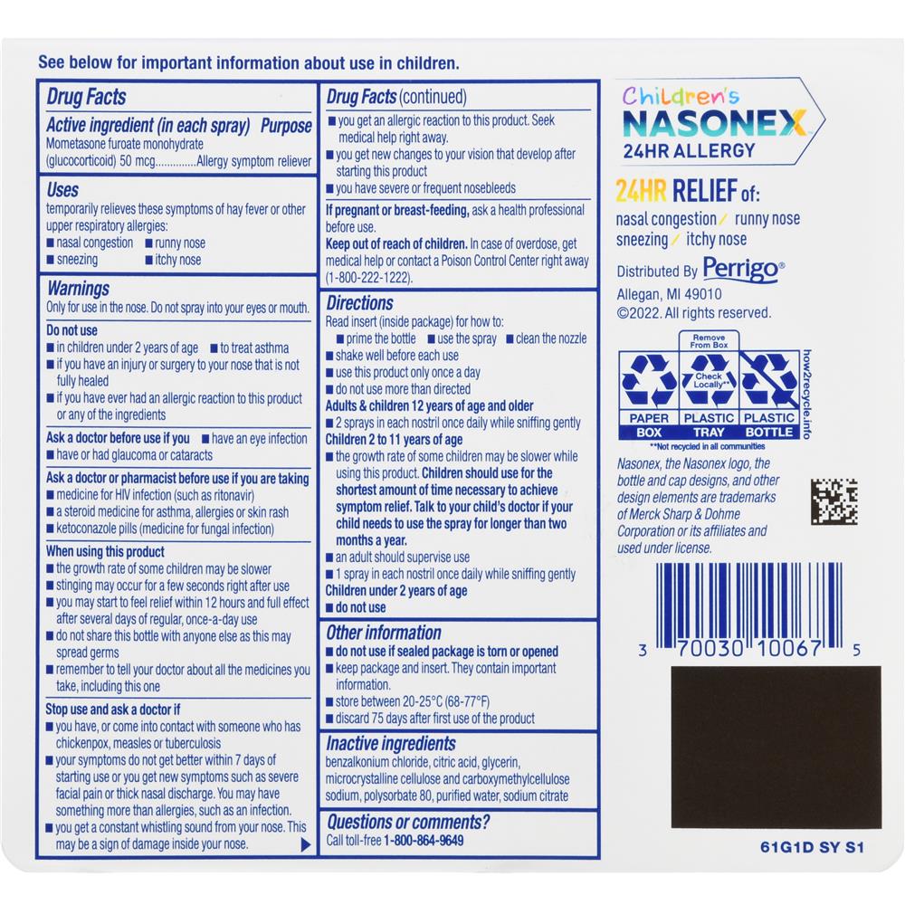 Take the sting out of allergies with Nasonex 24HR Allergy, now available over the counter (OTC) in full prescription strength. This easy-to-use nose spray offers all day and all night relief of your toughest allergy symptoms, including nasal congestion, runny nose, sneezing and itchy nose. Nasonex nasal spray delivers powerful allergy medicine directly to the site of congestion, targeting your uncomfortable symptoms of hay fever, seasonal, indoor or outdoor allergies. Powered by the active ingredient mometasone furoate, 50 mcg per spray, this glucocorticoid steroid medicine effectively alleviates allergies and congestion without leaving you feeling drowsy or sleepy. Celebrate life without annoying allergy symptoms. Celebrate normal with Nasonex!Specifications