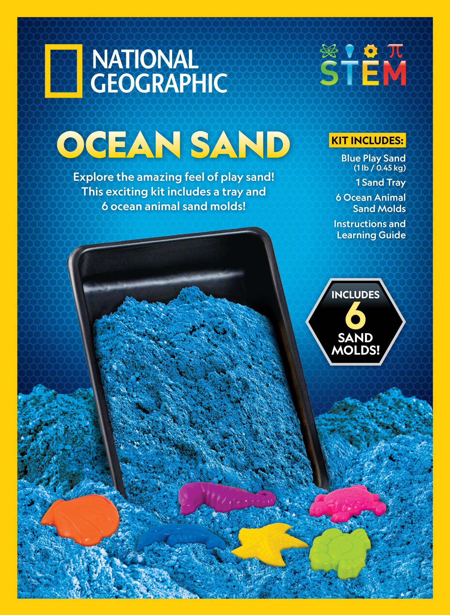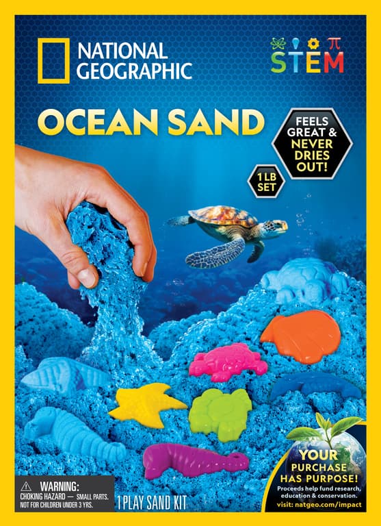 Experience the amazing feel of play sand with National Geographic’s Ocean Sand! This amazing kit gives kids a sensory experience they’ll love, with 1-pound of play sand that feels great and never dries out. There is a play tray inside along with 6 ocean-animal sand molds kids can use to shape their sand. They can also sculpt their own shapes or use molds from home for even more fun! Get Ocean Sand today!Specifications