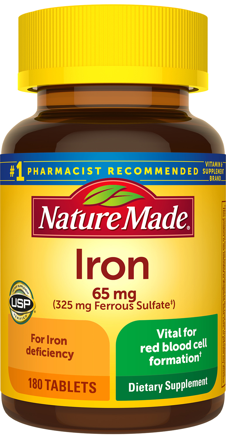 Nature Made Iron provides 65 mg iron to help those who lack in iron meet their nutritional needs. Iron is an essential part of hemoglobin, the protein substance which enables red blood cells to carry oxygen throughout the body. Now that's a breath of fresh air!Provides 65 mg of iron, which is vital for red blood cell formation. Because red blood cells are kind of a big deal.An essential nutrient for women in their reproductive yearsVital for red blood cell formationHelps support adequate iron in the body for overall healthUnited States Pharmacopeia (USP) VerifiedSpecifications