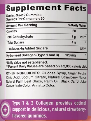 Feed your inner beauty with our delicious Collagen gummies! Our Collagen gummies are specially designed to boost your inner glow by providing you with two vitalizing Collagens Type I and Type III. Bursting with a naturally delicious strawberry flavor, our Collagen gummies provide you with 120 mg of this powerhouse protein per serving. Not only do they taste delicious, but you’re also getting all the amazing benefits Collagen has to offer. Plus, with only 3 grams of sugar per serving of two gummies, you’ll feel great about adding them to your wellness routine.We know how important a clean wellness experience is for you. That is why we use only the best ingredients when it comes to crafting our Beauty Collagen Gummies. Our superior formula is Non-GMO, gluten free, dairy free, free of other common allergens, and created without any artificial flavors.Specifications