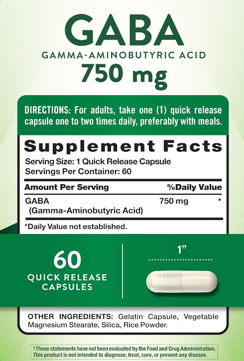CHILL WITH GABA: This naturally occurring-amino acid helps with mild, occasional stressSOOTHING FORMULA: Daily capsules make it easier than ever to support a relaxed, calm moodPURITY & POTENCY: Nature's Truth delivers high-quality ingredients tested for purity and potencyEXPERTS YOU CAN TRUST: Backed by three generations of Vitamin Innovators for unrivaled qualityNATURALLY FREE OF: Gluten, Wheat, Yeast, Milk, Lactose, Artificial Flavor & Sweetener & NON-GMOWhat is GABA? Dealing with daily stress? It's time to take a break! GABA (Gamma-Aminobutyric Acid) is a naturally occurring amino acid that helps with mild, occasional stress. This compound is used traditionally in vitamin products to promote tranquility and calmness.How to Get GABA? GABA is found in many product forms. Some of the most common include tea, pills, gummies, chewable tablets, lozenges, powder, liquid, plus more. Now, there is a convenient way to experience the comforting support of GABA and get peace of mind! Nature's Truth's formula is best for chilling out during downtime.Nature's Truth's GABA: Soothe your mind with this beneficial amino acid! Known for supporting a relaxed mood, GABA plays an important role in helping with mild, occasional stress. Our quick release capsules provide you with 750 mg of GABA per serving, making it easier than ever to add some calm to your wellness routine.Purity and potency are our top priorities at Nature's Truth, which is why our formula is Non-GMO, Gluten-Free and contains no Artificial Flavor, Sweetener or Preservatives.Specifications