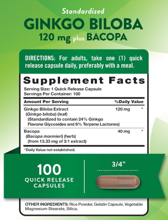 FRESH BOTANICALS: Our Ginkgo supplement is extracted from the purest sourcesPOTENT EXTRACT: Delivers 120 mg of potent Ginkgo Biloba in Quick Release capsules for max supportADDED HERBS: Includes Bacopa Monnieri, an indigenous Chinese herb utilized in Ayurvedic traditionsNATURE'S TRUTH SUPPLEMENTS: Backed by three generations of Vitamin Innovators for unrivaled qualityNATURALLY FREE OF: Gluten, Wheat, Yeast, Milk, Lactose, Soy, Artificial Color & Flavoring & NON-GMOWhat is Ginkgo Biloba? Ginkgo Biloba is a tree that is widely cultivated in China and used in wellness traditions. Its leaves, roots and seeds have been used for centuries and can be found in various herbal supplements. Ginkgo Leaf is touted for its exceptionally strong natural antioxidant concentration. Flavonoids and Terpenoids are the most well-known compounds attributed to the Ginkgo Herb. How to get Ginkgo Biloba: This energetic plant is often refined and added to dietary supplement formulas to support wellness. The most common products include: tea, pills, bulk powder, liquid, tablets, gummies, tinctures, drops, softgels, chewables, essential oils and more. Nature's Truth has now created a cutting-edge Ginkgo supplement formula that is the best available. Here's how... About Standardized Ginkgo Biloba: Our 120mg Ginkgo formula is sourced from the purest raw extract imaginable. We cultivate our product through pristine manufacturing procedures to ensure exceptional quality and potency. Plus, we've added Bacopa Monnieri Extract to our formula for a synergistic effect. A single Quick-Release capsule delivers the purest herbal nutrients and benefits from nature. Don't settle for anything less!Specifications