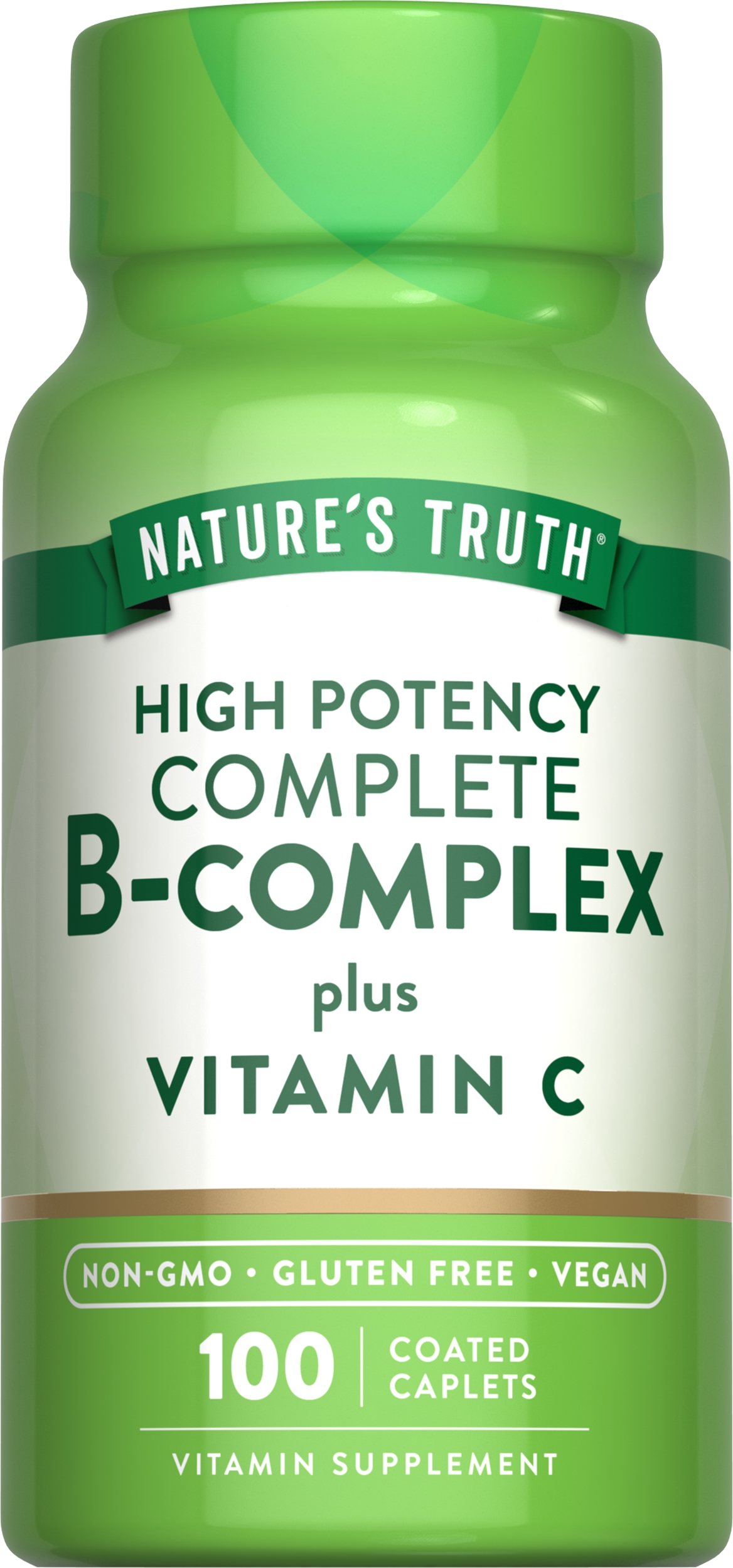 COMPLETE COMPLEX: Features a balanced blend of B Vitamins plus Vitamin C for maximum supportOPTIMAL FORM: Our Coated Caplets make it super convenient to receive 100% of your daily valuePURITY & POTENCY: Nature's Truth delivers high-quality ingredients tested for purity & potencyEXPERTS YOU CAN TRUST: Backed by three generations of Vitamin Innovators for unrivaled qualityNATURALLY FREE OF: Gluten, Wheat, Yeast, Milk, Lactose, Artificial Flavor & Sweetener & NON-GMOSupplementing with B-Vitamins: There are eight B vitamins collectively called B complex vitamins. This includes thiamine (B-1), riboflavin (B-2), niacin (B-3), pantothenic acid (B-5), pyridoxine (B-6), biotin (B-7), folate (B-9) and cobalamin (B-12). B Vitamins are naturally present in foods like Whole Grains, Red Meat and Dairy. How to get B-Vitamins: Many people turn to Vitamins to supplement their daily lifestyle. B-Vitamins are typically found in products such as Pills, Gummies, Capsules, Liquid, Powder and Chewable Tablets. A valuable B-Vitamin Complex comes from a professional source backed by years of experience and expertise. Why choose Nature's Truth's Vitamins? Nature's Truth's B-Complex: Our High Potency Complete B-Complex contains a synergistic blend of Essential B Vitamins such as Thiamin, Riboflavin, Niacin plus Vitamin C for added support. Our Coated Caplets make it easier than ever to get all the amazing benefits B Vitamins have to offer in a complex that provides 100% or more of your daily value! Purity and potency are our top priorities at Nature's Truth, which is why our formula is Non-GMO, Gluten-Free and contains no Artificial Flavor, Sweetener or Preservatives.Specifications