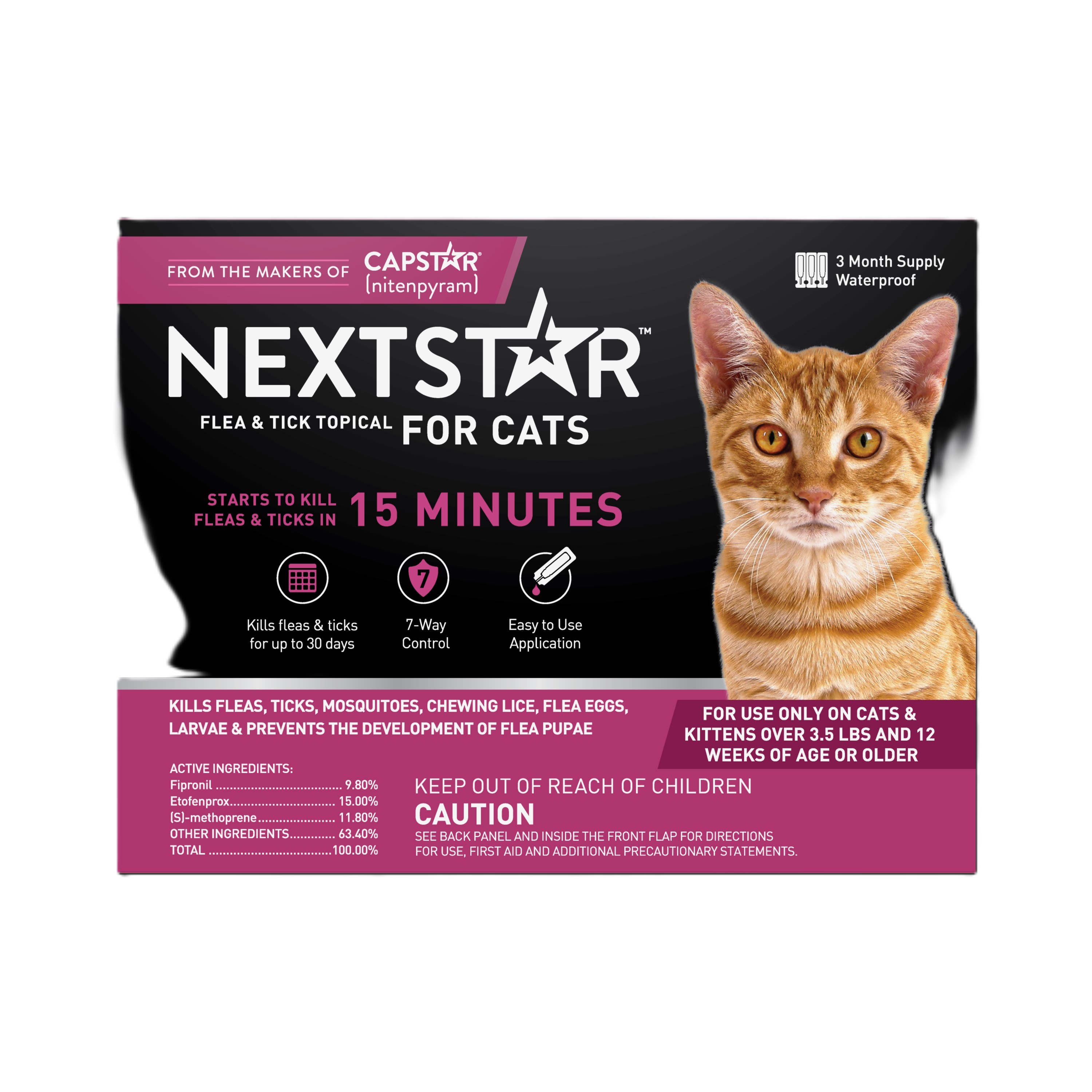 When it comes to fleas and ticks, time is of the essence. That’s why you can trust NextStar for fast-acting, long-lasting protection. NextStar Flea & Tick Prevention for Cats, 3 Count is a fast-acting 30-day flea & tick topical protection. Our veterinarian recommended topical formula provides your cat with 7-way pest protection against fleas, ticks, mosquitoes, chewing lice, flea eggs, larvae, & prevents the development of flea pupae - with no prescription needed. NextStar is an easy-to-use, waterproof topical formula that breaks the flea lifecycle and starts working in 15 minutes for 30 days of protection. Apply NextStar once every 30 days for year-round protection from fleas and ticks. Rest easy knowing your cat is protected with a fast-acting flea & tick topical from NextStar. Data on File.Specifications