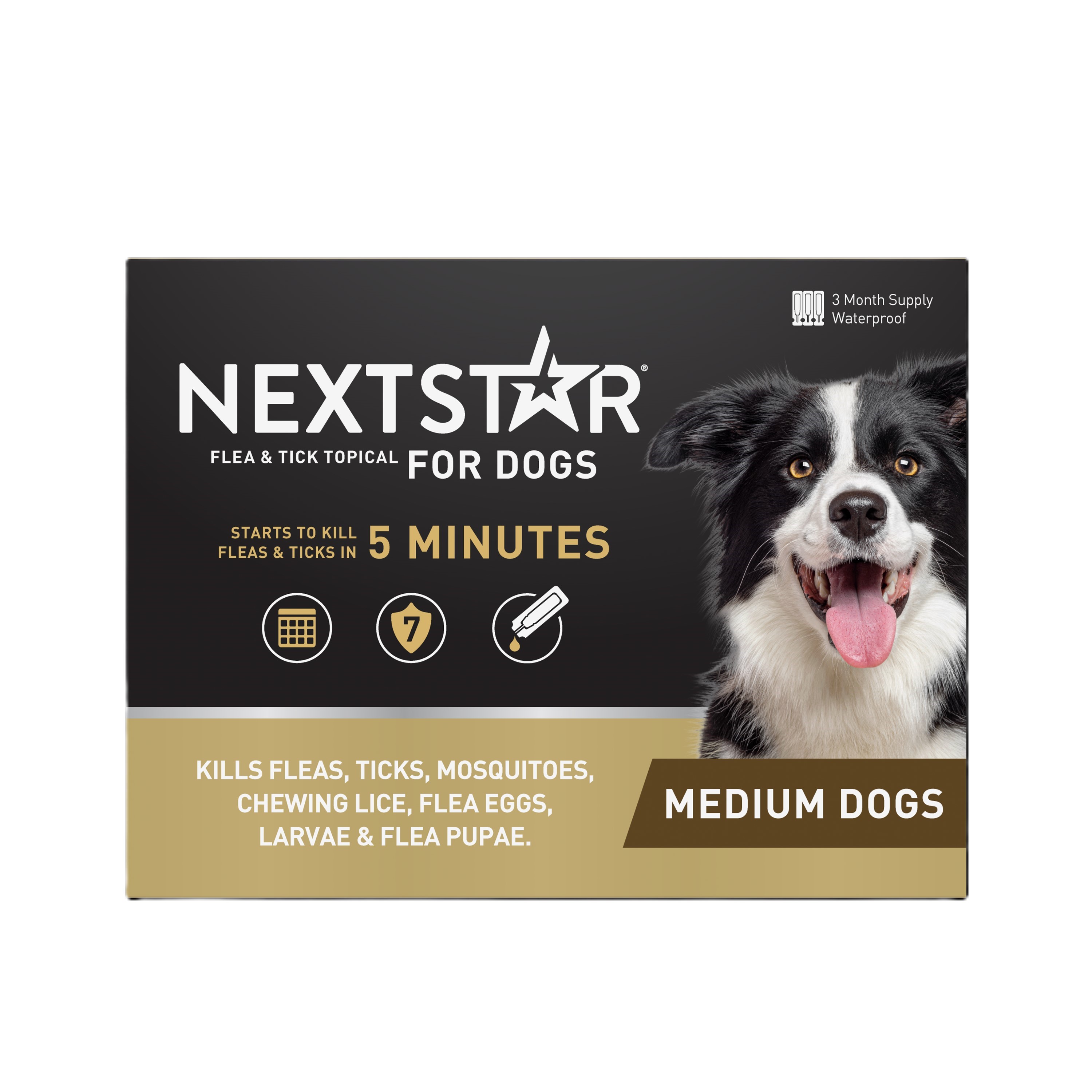 When it comes to fleas and ticks, time is of the essence. That’s why you can trust NextStar for fast-acting, long-lasting protection. NextStar Flea & Tick Prevention for Medium dogs 23-44 lbs, 3 Count is the fastest-acting 30-day flea & tick topical protection available. Our veterinarian-recommended topical formula provides your dog with 7-way pest protection against fleas, ticks, mosquitoes, chewing lice, flea eggs, larvae, & prevents the development of flea pupae - with no prescription needed. NextStar is an easy-to-use, waterproof topical formula that breaks the flea lifecycle and starts working in 5 minutes for 30 days of protection. Apply NextStar once every 30 days for year-round protection from fleas and ticks. Rest easy knowing your dog is protected with the fastest-acting flea & tick topical from NextStar. Fastest-acting comparison for dog formula only. Based on label claims for NextStar flea and tick topical for dogs and other leading dogs topical brands.Data on file.Specifications